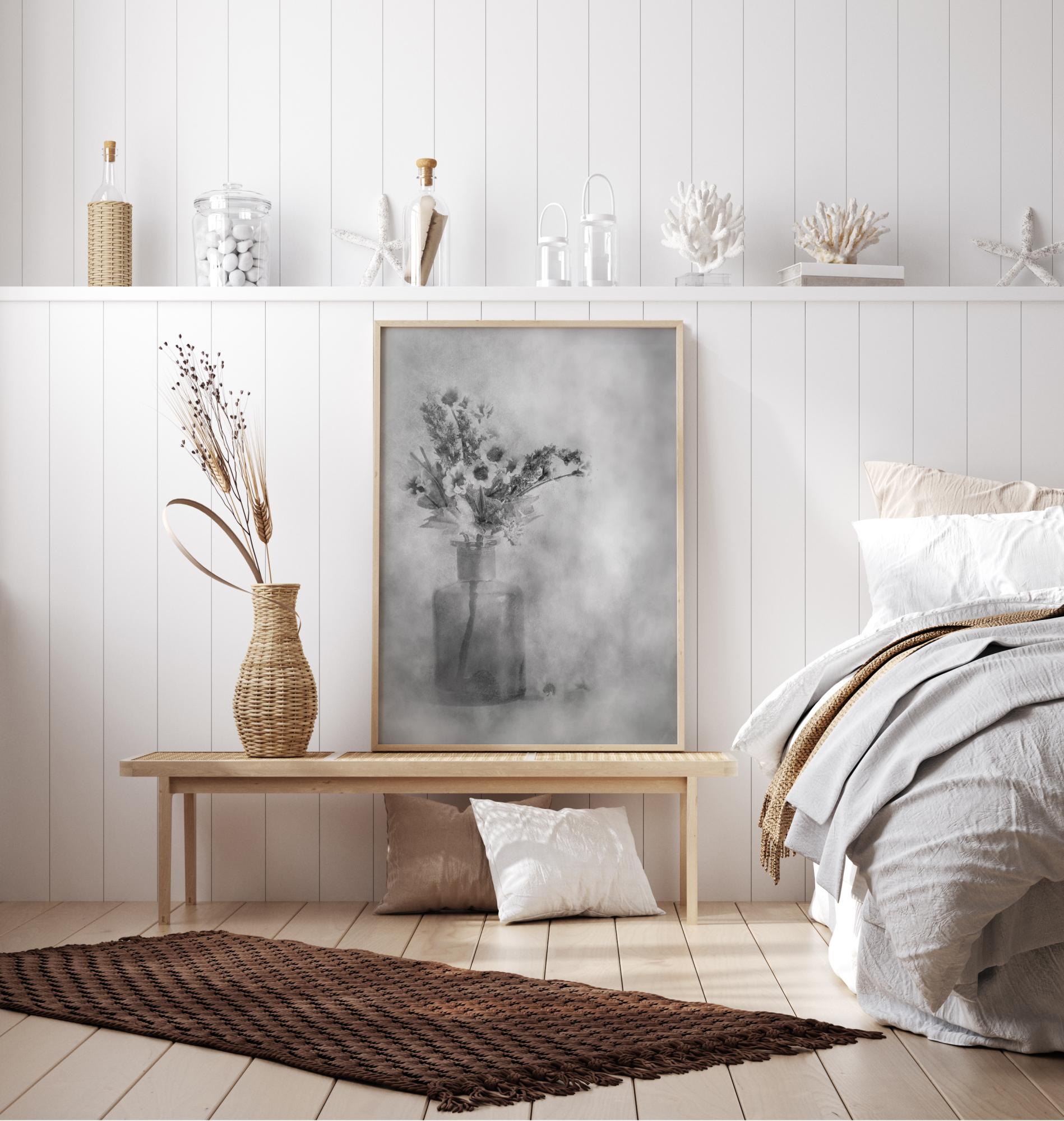 Romantyczny plakat z miękką martwą naturą z wazonem i kwiatami. Ten obraz w odcieniach szarości ma delikatnie malowany charakter i minimalne kontrasty między różnymi elementami obrazu. Wyobraź sobie, że sam przygotowujesz się do namalowania tej spokojnej sceny, gdy wieszasz ją na pastelowej ścianie w domu.