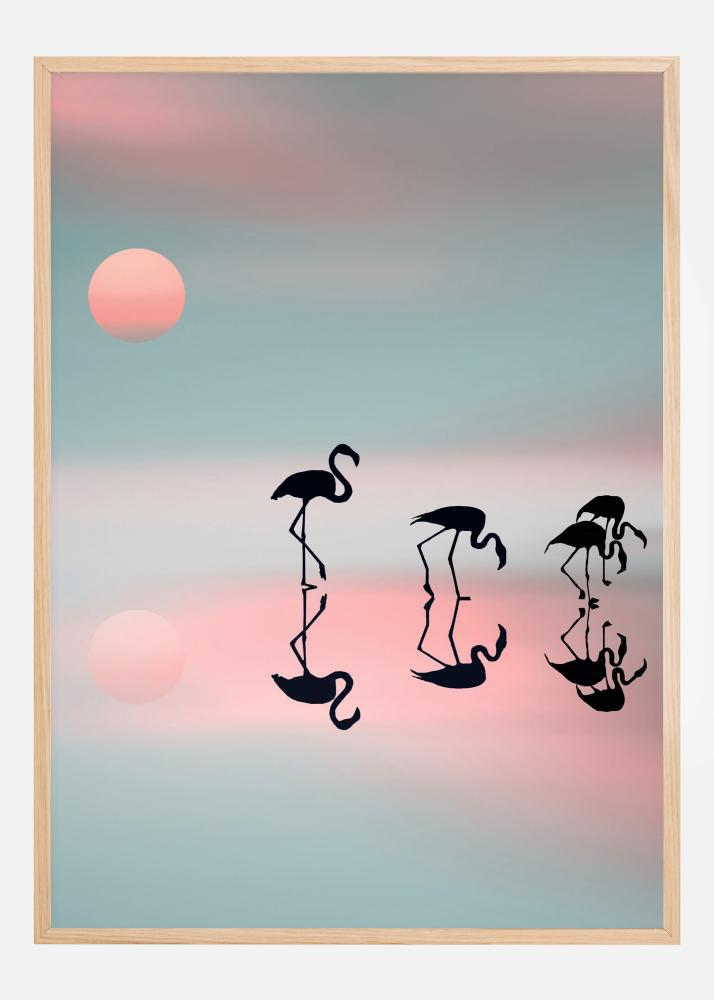 Jaskrawy plakat z czterema flamingami jedzącymi przy jasno pastelowym jeziorze. Niebieskie, różowe i brzoskwiniowe światło tworzy delikatny obraz z sylwetką rodziny flamingów, które ostrożnie wędrują po jeziorze. Możesz niemal poczuć spokój w tym miękkim, subtelnych obrazie.
