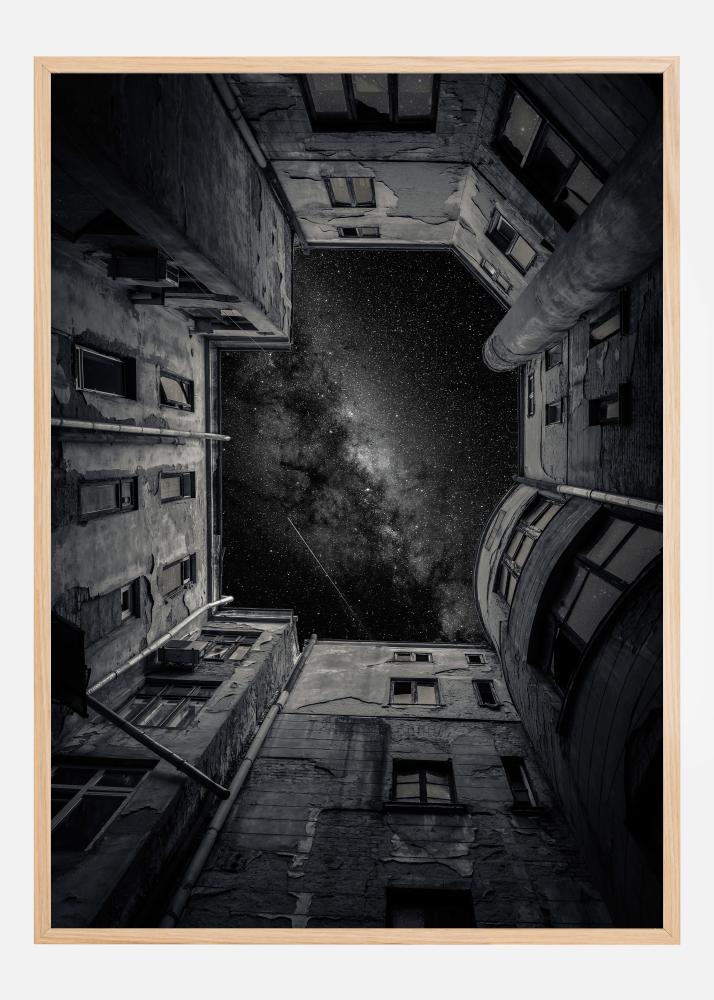 Plakat łączy architektoniczne piękno miasta z naturalnym pięknem kosmicznym, co tworzy sugestywny kontrast między miejskim a uniwersalnym. Monochromatyczna kolorystyka z odcieniami czerni, bieli i szarości sprawia, że obraz łatwo zintegrować w różne style wnętrz i byłby interesującym tematem do rozmowy w każdym pomieszczeniu.