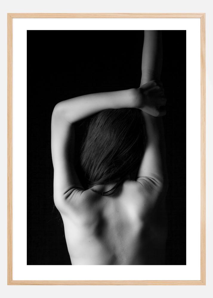 Plakat portretowy przedstawiający plecy kobiety. Ten czarno-biały obrazek podkreśla równomierne mięśnie pleców, podczas gdy ona podnosi jedno ramię wysoko i zgina drugie ramię ponad głowę. Części jej są ukryte w cieniu. Powieś to dzieło w domu, aby uzyskać nieco artystyczne wrażenie.