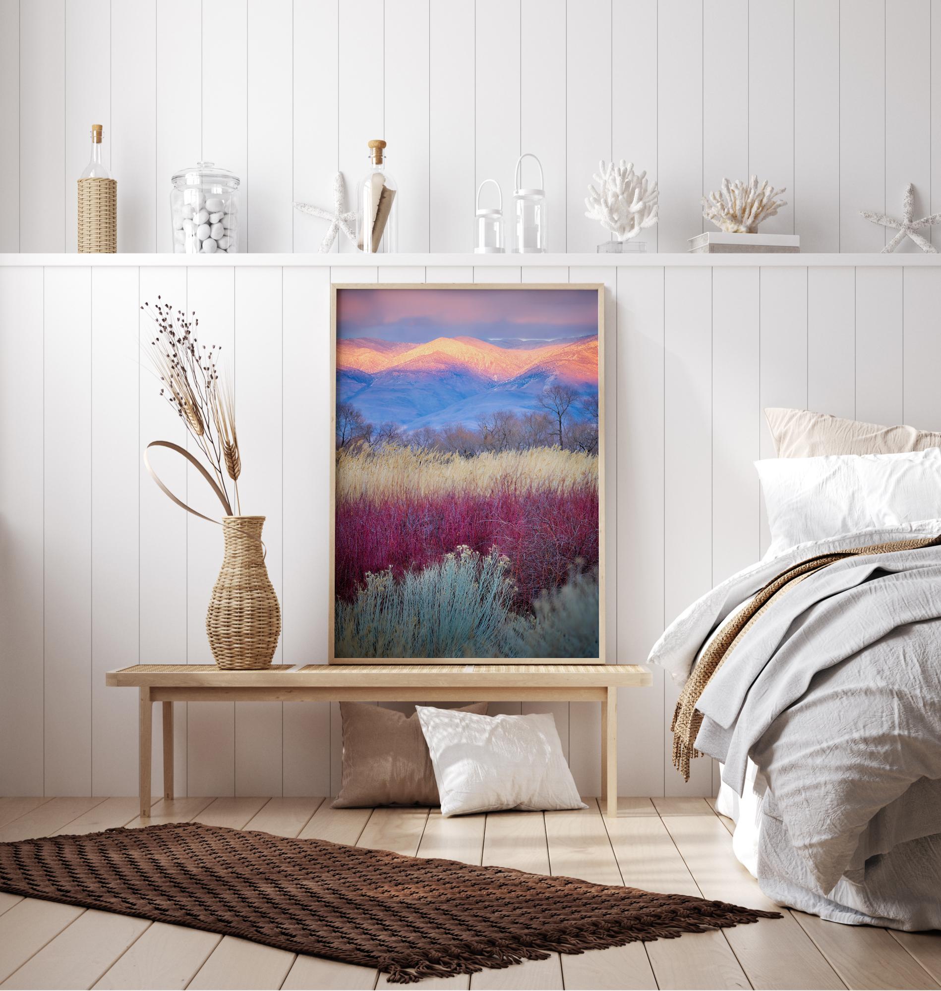 Kolorowy plakat przedstawiający pola rozciągające się w kierunku odległych gór. Jasne kolory prowadzą wzrok od zieleni, różu, żółci, błękitu do pomarańczy. Słońce ledwie wyłania się nad górami w oddali. Poczuj wczesne światło poranka i nowy dzień w tym dziele.