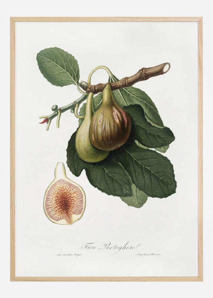 Plakat botaniczny z ilustracją figi. Ten obrazek przypomina stare tablice szkolne, z ich prostymi, ale wciąż szczegółowymi rysunkami na ścianie. Malowidło akwarelowe uchwyca wszystkie szczegóły, pokazując również przekrój figi i nasiona wewnątrz.