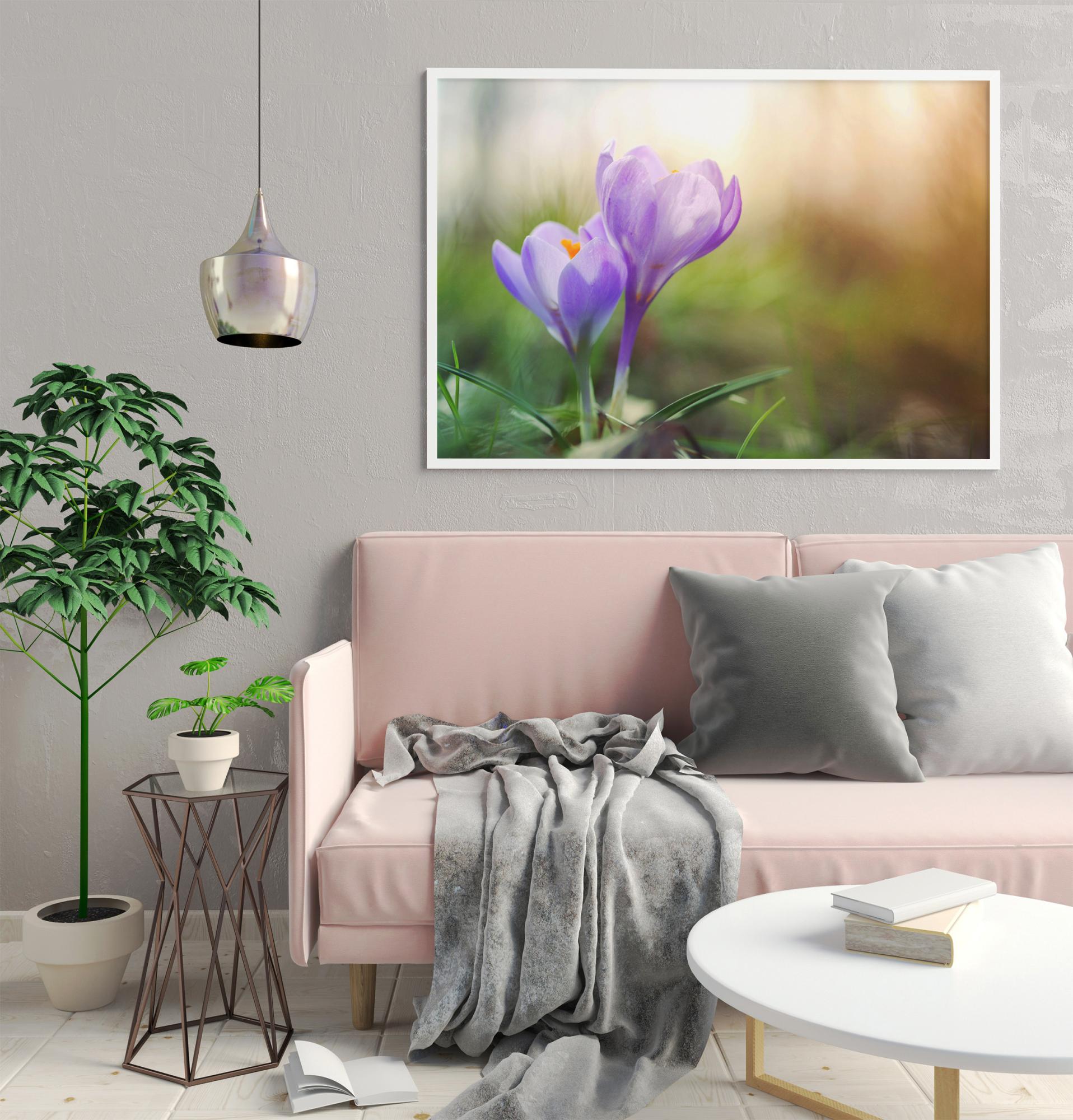 Uroczy obrazek prawdopodobnie najbardziej kolorowego wielbiciela słońca wiosny, krokusa. Rozmyte tło w kolorze dopełniającym nadaje kwiatom lekkości i harmonii zdjęciu. Pasuje dla tych, którzy chcą mieć radość kolorów w domu, a zawsze dobrze jest użyć odcienia z obrazu jako koloru akcentującego w reszcie wnętrza. Chętnie łączyć z innymi motywami roślinnymi, aby stworzyć poczucie całości w pomieszczeniu.