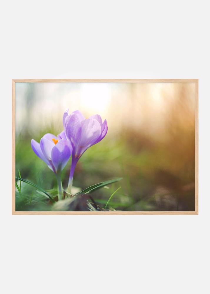 Urocze zdjęcie może najbarwniejszego miłośnika słońca wiosny, krokusa. Rozmyte tło w kolorze dopełniającym nadaje kwiatom podkreślenie, a fotografii harmonię. Pasuje dla tych, którzy chcą mieć radość barw w domu, a zawsze miło jest użyć odcienia z obrazu jako koloru akcentującego w pozostałym wystroju. Chętnie łącz z innymi motywami roślinnymi, aby stworzyć poczucie całości w pomieszczeniu.