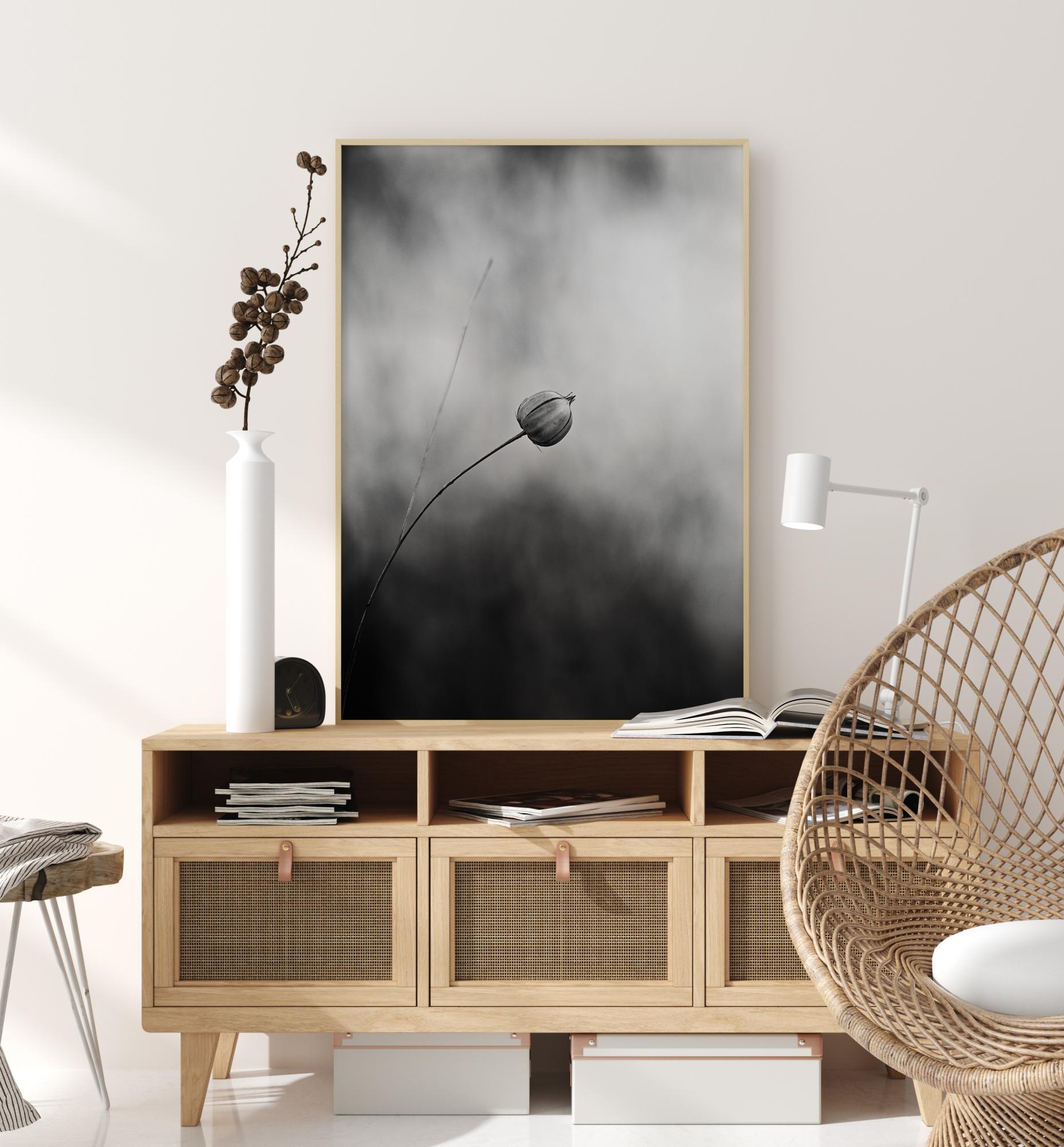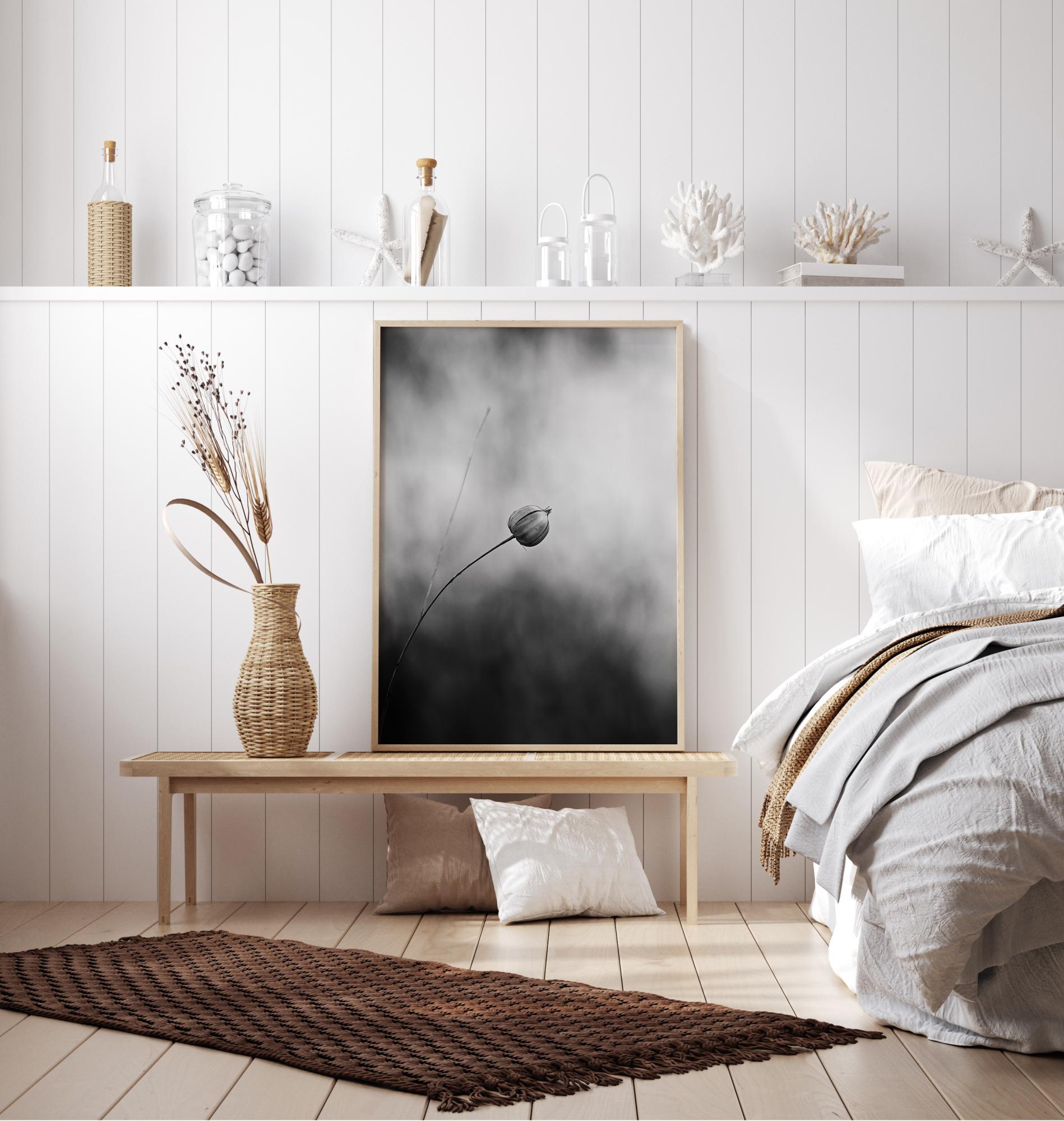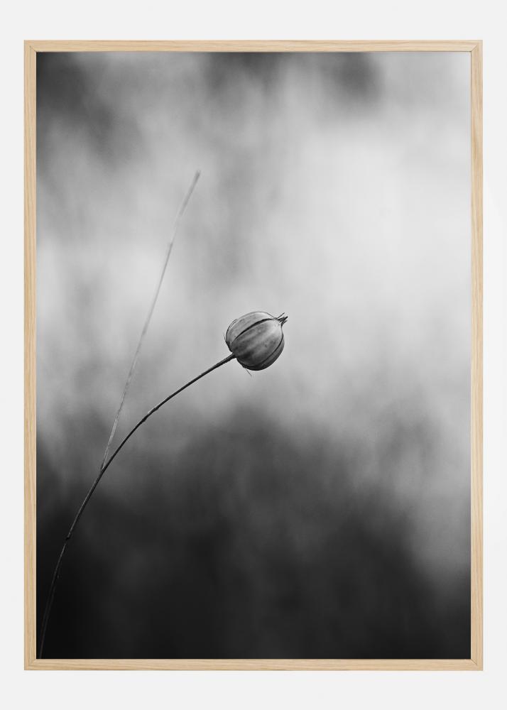 Czarno-biały plakat z jedną rośliną lnu po przekwitnięciu. Len zgina się ku środkowi obrazu, wyraźnie odznaczając się na tle białego światła. Poniżej tło jest ciemne i nieostre, aby skupić uwagę na jedynym kwiecie. Dodaj temu dziełu kolor poprzez ścianę akcentową.