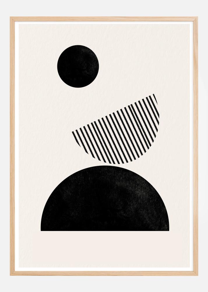 Ten artystyczny plakat charakteryzuje się zabawnym wykorzystaniem geometrycznych kształtów i faktur w celu stworzenia zrównoważonej i nowoczesnej kompozycji. Duże czarne koło znajduje się na górze, po którym następuje diagonalnie żłobiona półokrąg i solidny czarny półokrąg u podstawy. Każdy element przyczynia się do poczucia ruchu i dynamiki, a jednolita kolorystyka tworzy poczucie spójności i prostoty.