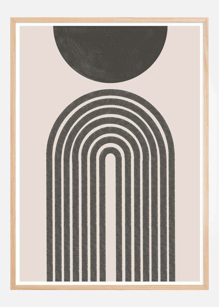 Ten artystyczny plakat pokazuje połączenie geometrycznej precyzji z organiczną miękkością. Górna część projektu składa się z czarnej półkola, która emanuje uspokajającą obecnością na tle ciepłego, neutralnego tła. Poniżej, wznosi się seria czarnych łuków harmonijnie tworzących formę przypominającą portal, co tworzy kontrast między ścisłą geometrią a abstrakcyjnymi krzywiznami czarnego koła. Prosta kolorystyka z czernią na tle off-white daje nowoczesne i eleganckie wrażenie, idealne do współczesnego domu lub biura.
