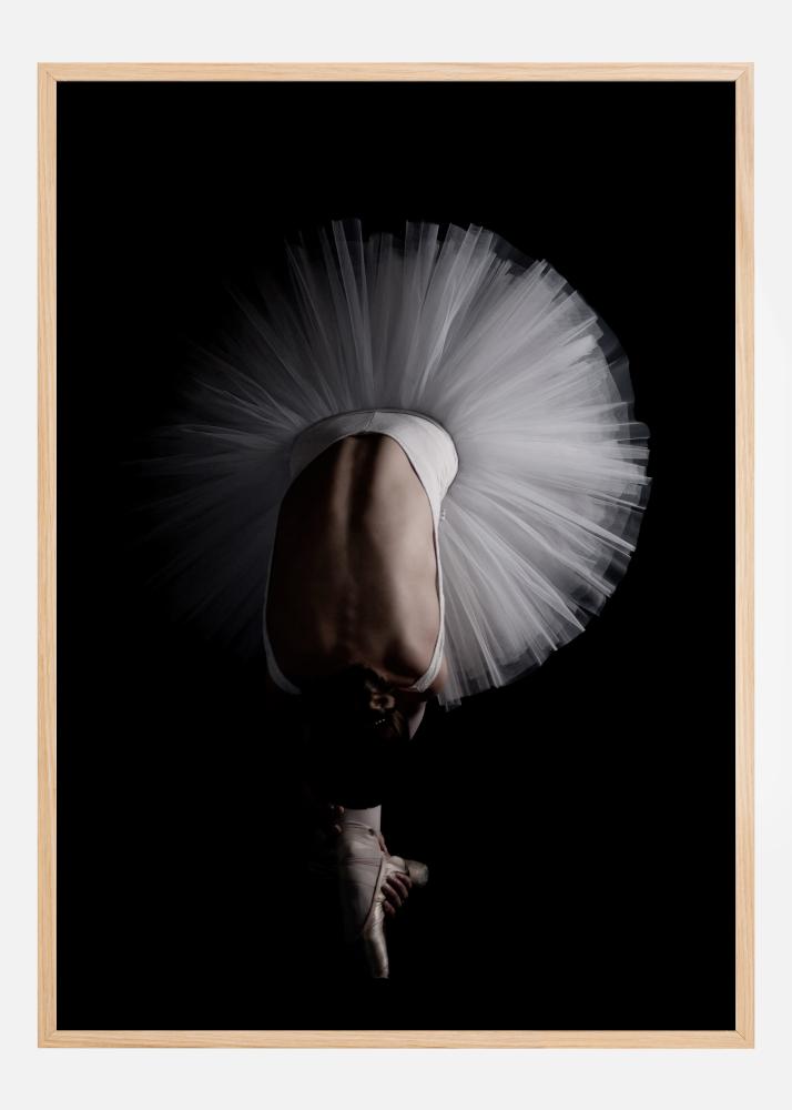 Dramatyczny plakat z lotu ptaka z baletnicą, która pochyla się, aby sięgnąć do swoich butów. Czarny, tło sprawia, że biała spódnica baletowa wyróżnia się jasnym okręgiem wokół niej. Mocne linie na plecach prowadzą wzrok do elegancko postawionych stóp. Elegancja i dramat łączą się w tym unikalnym obrazie.