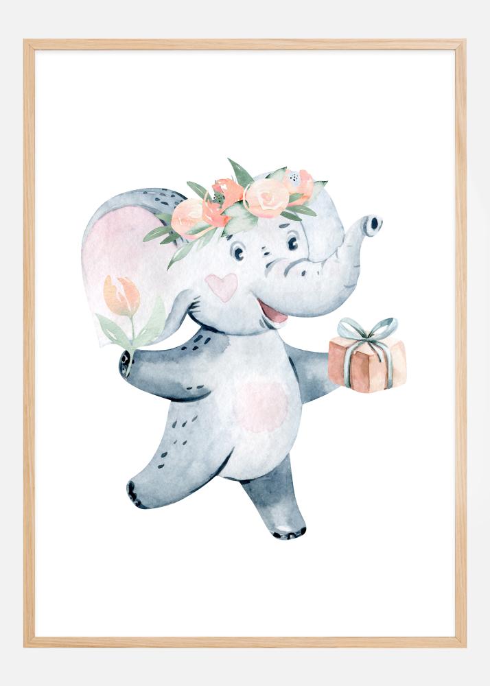 Rozjaśnij atmosferę w każdym pomieszczeniu za pomocą tego uroczej plakatu z słoniem, który emanuje radością i niewinnością. Oto uroczy mały szary słoń, który lekko przebiera nogami, ozdobiony kwietnym wieńcem w odcieniach różu i brzoskwini na głowie. Wyraz twarzy zwierzęcia jest pełen życzliwości i szczęścia, a trzyma ono starannie zapakowany prezent, co dodaje dodatkowego akcentu radości i hojności do sceny.