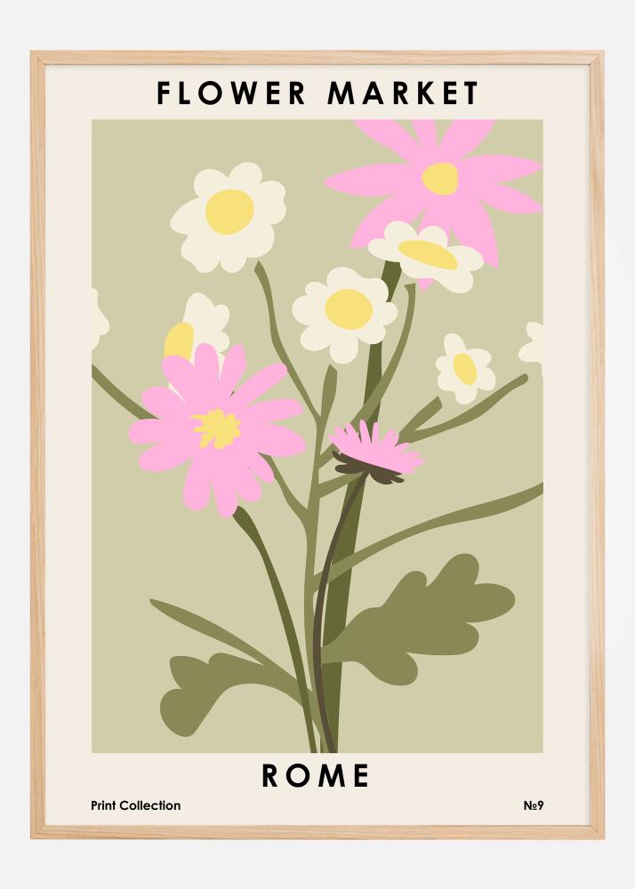 Dzięki jasnemu i przyjaznemu designowi, ten plakat przedstawia ciepłą i żywą atmosferę na rynku kwiatowym w Rzymie. Bogactwo detali i zabawne użycie kolorów jest w centrum uwagi, z dużymi różowymi kwiatami uzupełnionymi delikatnymi białymi kwiatami, wszystkie na tle uspokajającego oliwkowozielonego tonu. Ten druk jest idealny do wprowadzenia poczucia wiecznego miasta Rzym i jego miłości do piękna i natury w Twoją przestrzeń.