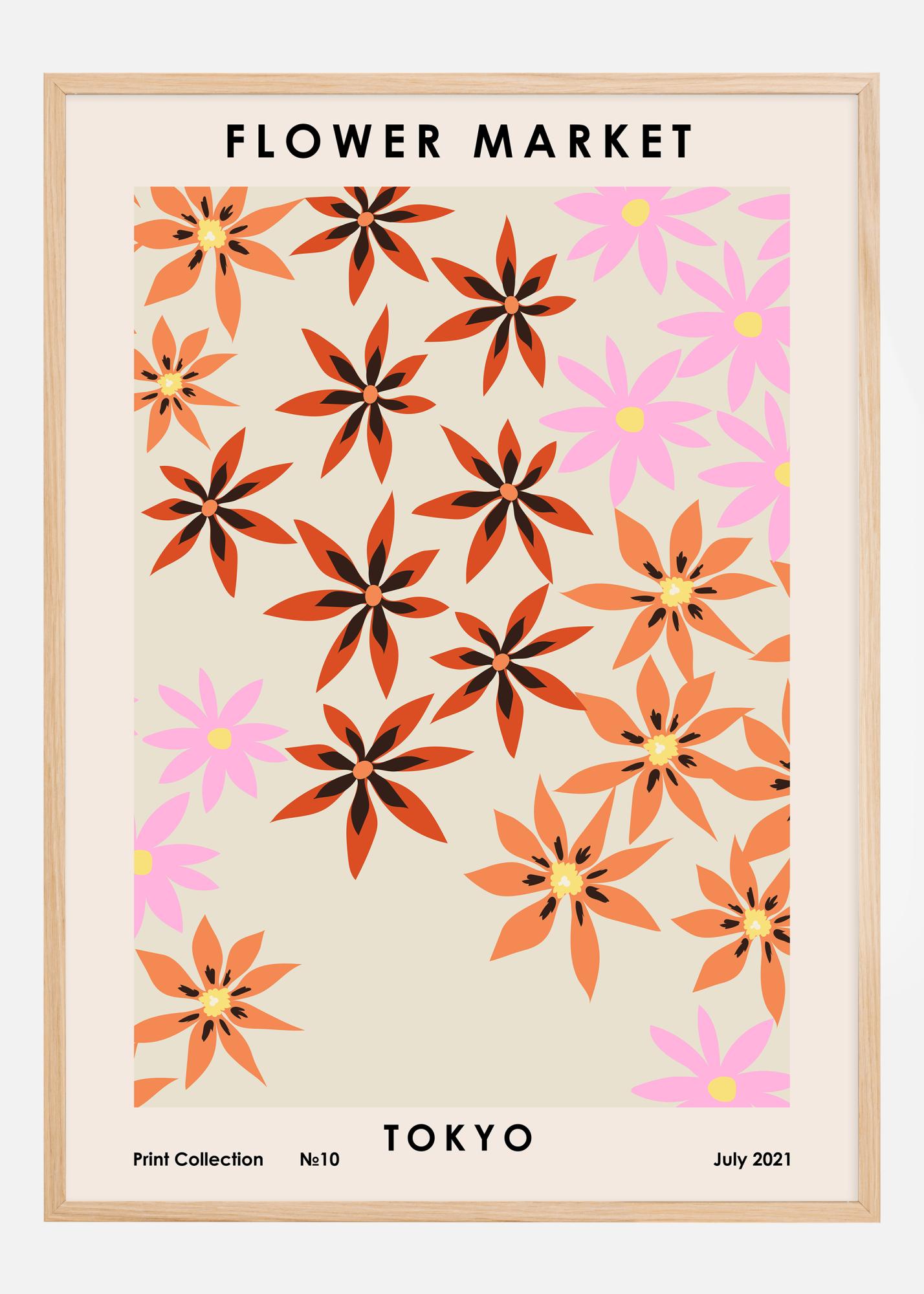 Ten żywy plakat uchwytuje istotę kwiatowego rynku w Tokio, z rozkwitającym wzorem kwiatów w kolorach koralowym, czarnym i różowym na jasnym beżowym tle. Ta afiszka wnosi wesoły i nowoczesny klimat, który wzbogaca każde pomieszczenie swoją estetyczną urodą. Każdy kwiat jest prosty, lecz artystycznie oddany, z odcieniami nadającymi projektowi głębię i wymiar.