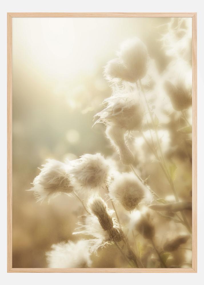 Magiczny plakat z puszystymi kwiatami w porannym świetle. Miękkie kule na kwiatach są oświetlone porannym światłem, tworząc anielskie aureole wokół każdego kwiatu. Miękkie pastelowe kolory pomagają stworzyć senny, magiczny nastrój delikatnego przebudzenia.