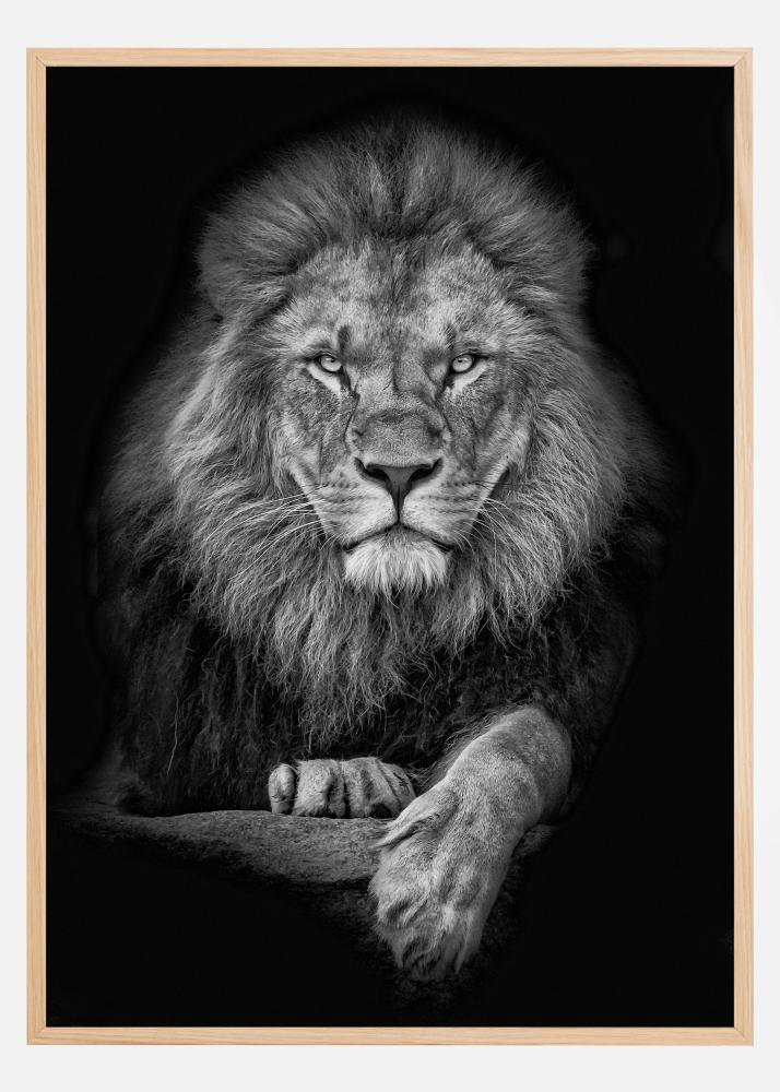 Czarno-białe zbliżenie fotograficzne lwa, który patrzy prosto na widza. Ciemne tło i intensywne spojrzenie tworzą wspaniałą siłę przyciągania do obrazu. To plakat, który prezentuje się równie dobrze samodzielnie, jak i w połączeniu z innymi ulubionymi w większej kompozycji.