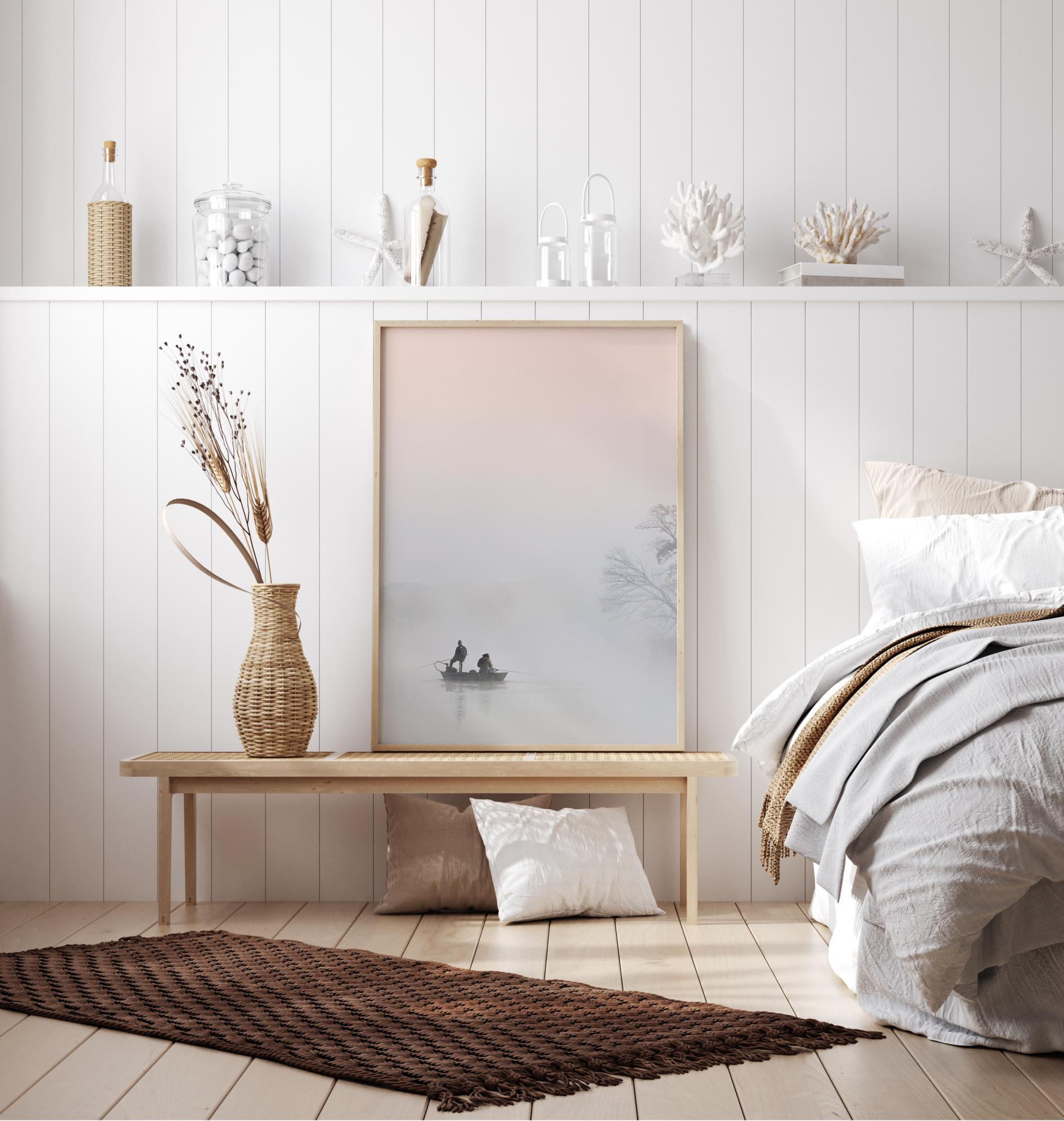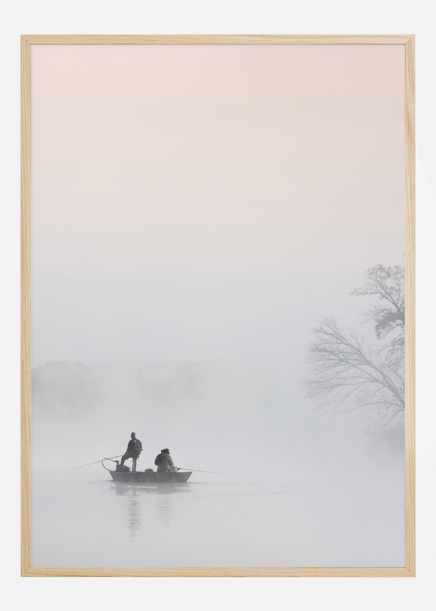 Magiczny plakat z dwoma mężczyznami łowiącymi ryby w łodzi w mglisty poranek. Mała łódka znajduje się po lewej stronie w sylwetce. Gałęzie drzew można zobaczyć po prawej, ale wszystko jest okryte białą mgłą, co czyni to magicznym obrazem. Ciesz się spokojem wczesnego poranka dzięki temu plakatowi.