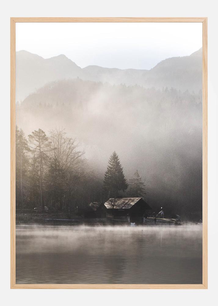 Przyjemny plakat z domkiem w górach nad brzegiem mglistego jeziora. Delikatne pastele nadają obrazowi łagodny charakter, a poranne słońce promieniejące z prawej strony unosi mgłę. Powieś go na prostej ścianie i zagub się w samotnej dziczy i prostocie tej nastrojowej grafiki.