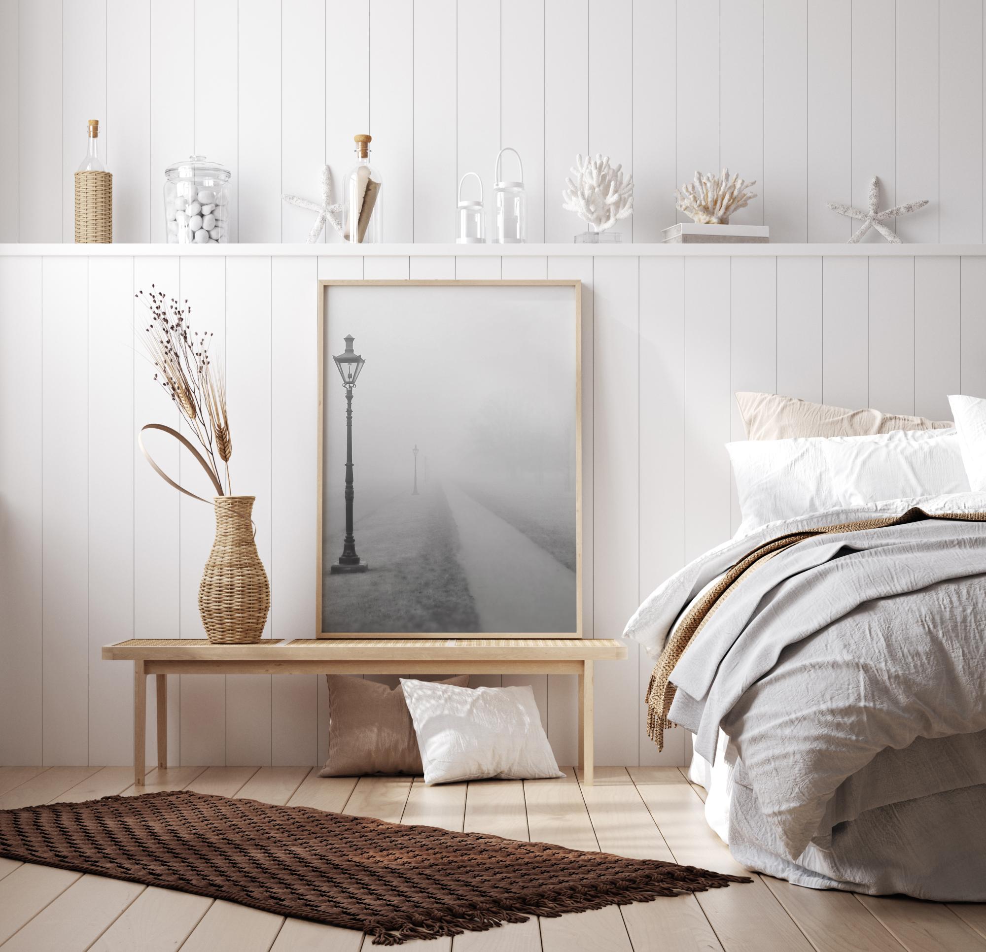 Miejski plakat z mglistą ulicą. Staromodne latarnie uliczne towarzyszą samotnej drodze, która znika w oddali we mgle. To subtelne zdjęcie niesie ze sobą mroczny spokój i poczucie zimowego chłodu. Utrzymaj atmosferę tego zdjęcia, wieszając je na białej ścianie.