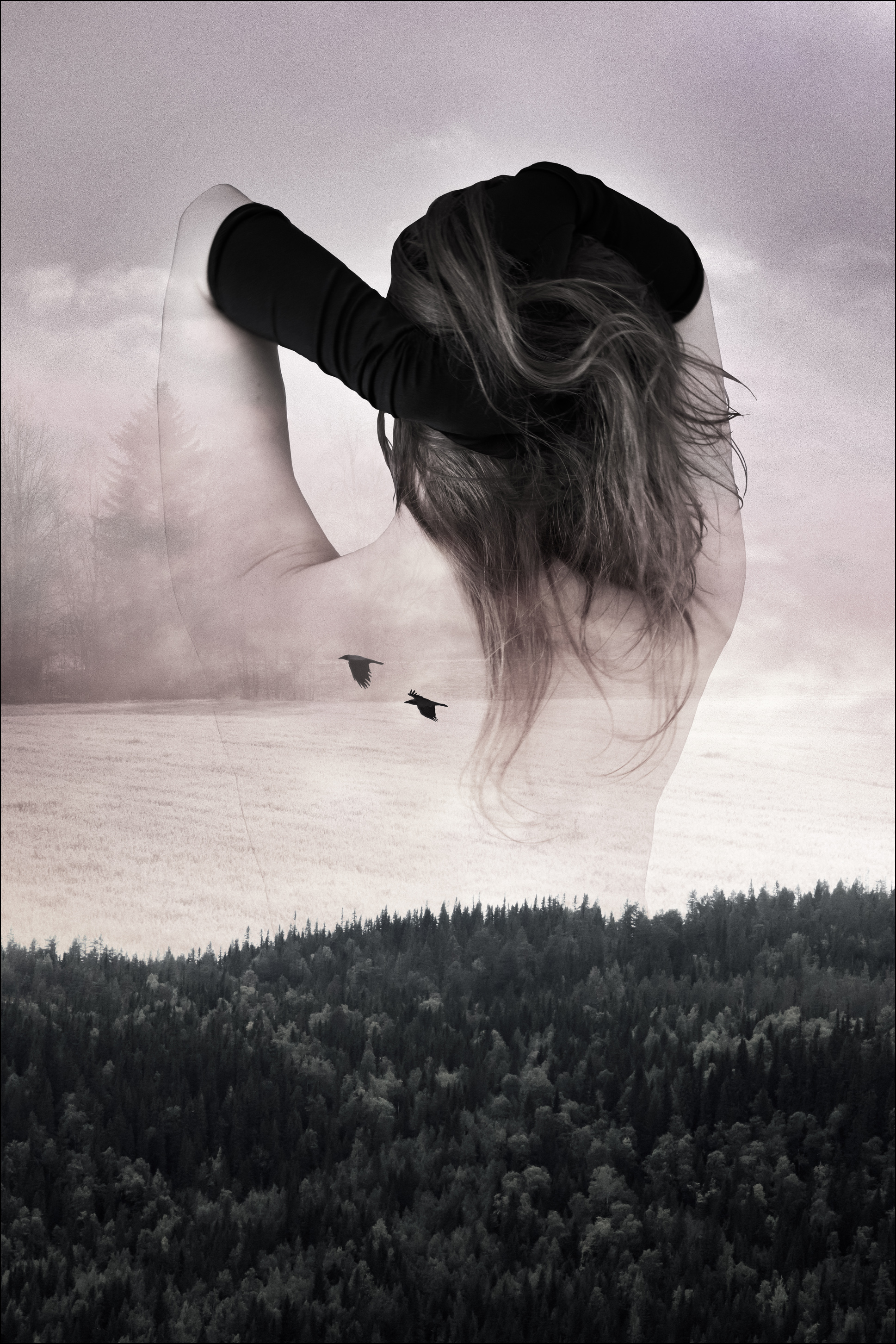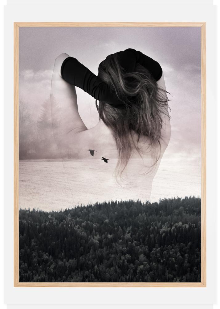 Plakat kolażowy z lasem i niebem u dołu oraz kobietą w warstwie powyżej obrazu. Duch lasu jest tu wyraźny, gdy ciemny las sięga nieba, gdzie kobieta w czarnej rękawiczce przeczesuje ręką włosy. Ciesz się niecodziennym składem tego naprawdę fantazyjnego obrazu.