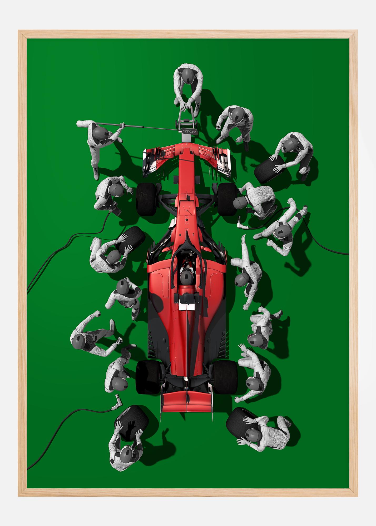 Z eksplozją kolorów i akcji, ten fascynujący plakat oferuje wgląd w świat pełen adrenaliny Formuły 1. Na odważnym zielonym tle ukazana jest ikoniczna scena pitstopu, gdzie zespół mechaników w srebrnych i białych kombinezonach pracuje w doskonałej synchronizacji wokół ostro czerwonego samochodu wyścigowego. Ta kontrastowa kompozycja jest hołdem dla sztuki szybkości i precyzji motorsportu.