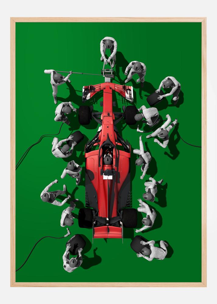 Z eksplozją koloru i akcji ten fascynujący plakat daje wgląd w pełen adrenaliny świat Formuły 1. Na odważnym zielonym tle przedstawiona jest ikoniczna scena pitstopu, gdzie zespół mechaników w srebrnych i białych kombinezonach pracuje w perfekcyjnej synchronizacji wokół ostro czerwonego samochodu wyścigowego. Ta kontrastowa kompozycja jest hołdem dla sztuki szybkości i precyzji motorsportu.