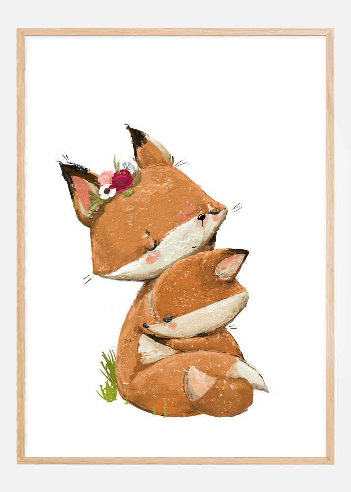 Zdefiniuj uczucie czułości na nowo dzięki temu pięknemu plakatowi przedstawiającemu matkę lisa przytulającą swoje młode dziecko w czułym objęciu. Ciepłe tony futra lisa wraz z delikatnymi kwiatami umieszczonymi na głowie tworzą obraz, który jest zarówno serdeczny, jak i estetycznie atrakcyjny. Ta ilustracja uchwyca istotę matczynej miłości i wyjątkowej więzi między rodzicem a dzieckiem.