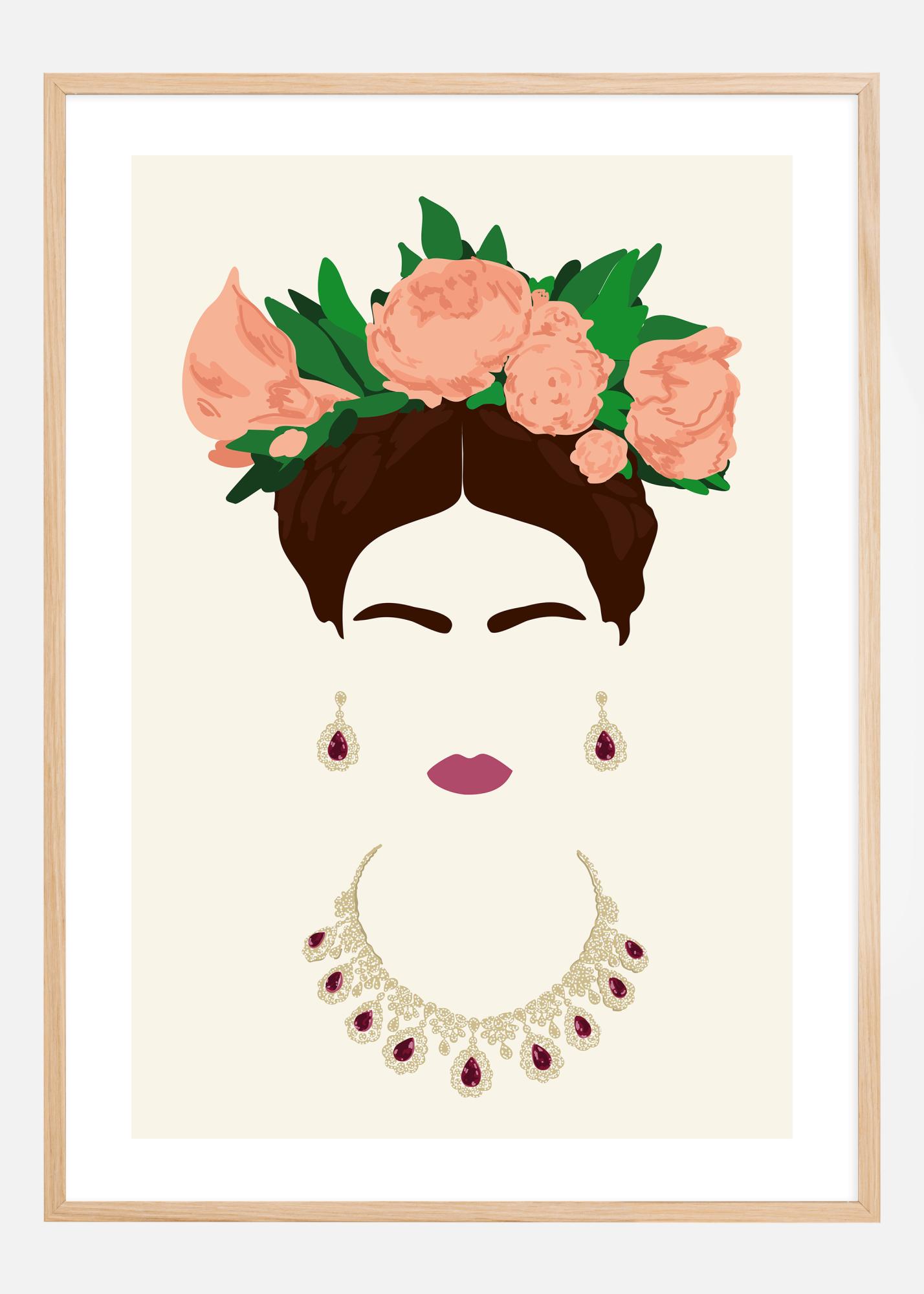 Ten wyjątkowy plakat przedstawia stylizowaną postać kobiecą ozdobioną bogatą florą i elegancką biżuterią. Motyw przedstawia harmonijną kompozycję ciemnobrązowych włosów, kremowej skóry i promienny wieniec koralowo-różowych kwiatów uzupełniony ciemnozielonymi liśćmi. Jej rysy twarzy zostały zredukowane do minimalistycznych form, co nadaje nowoczesnego charakteru.