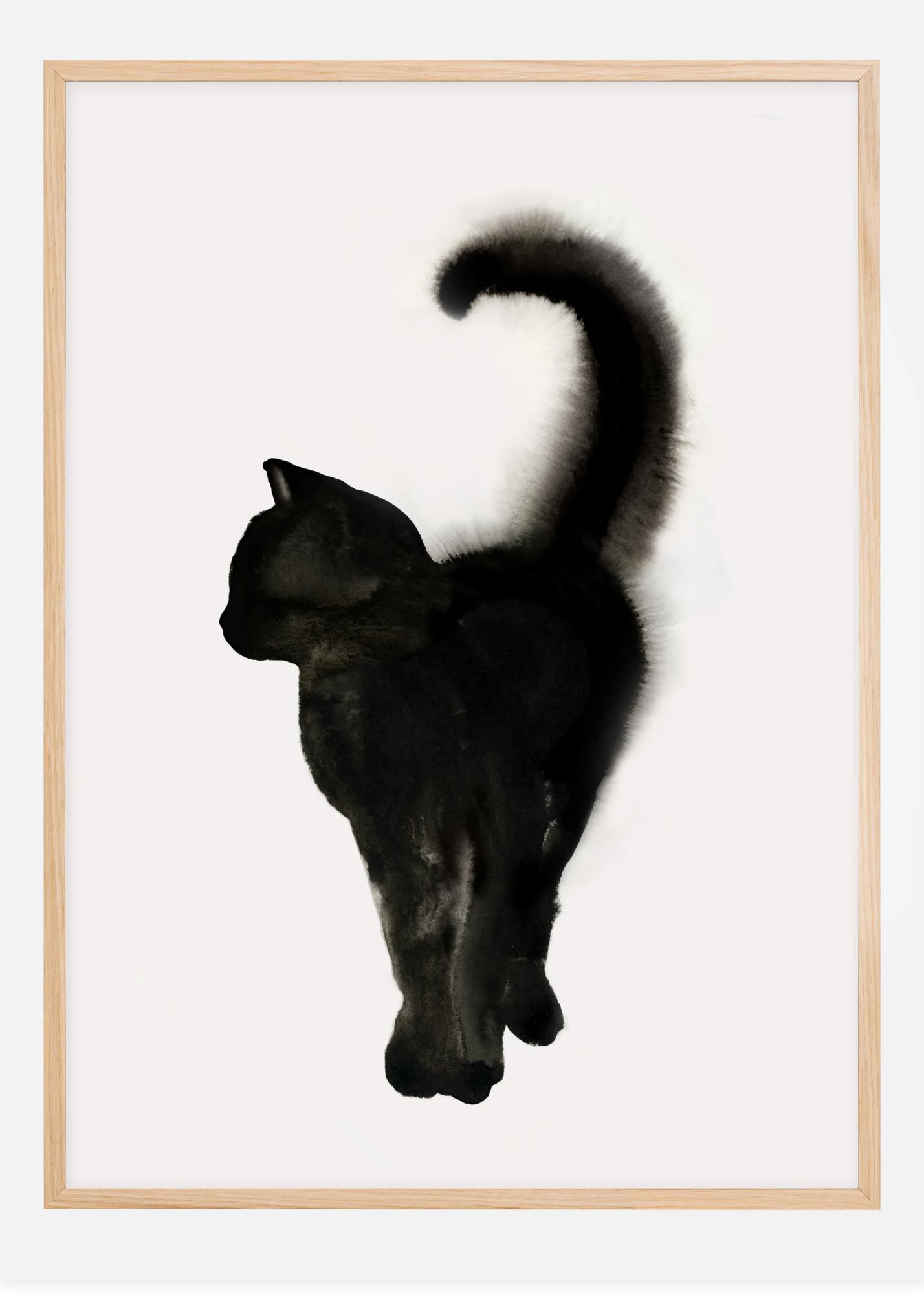 Plakat z motywem zwierzęcym, przedstawiający czarnego kociaka pozującego na białym tle. Czarny kot stoi z łapami razem i patrzy w lewo, z ogonem w pytającym zgięciu. Mieszanka ostrych konturów i miękkich pociągnięć pędzla nadaje temu prostemu obrazowi strukturę i czyni go bardziej interesującym, idealnym na każdą ścianę.