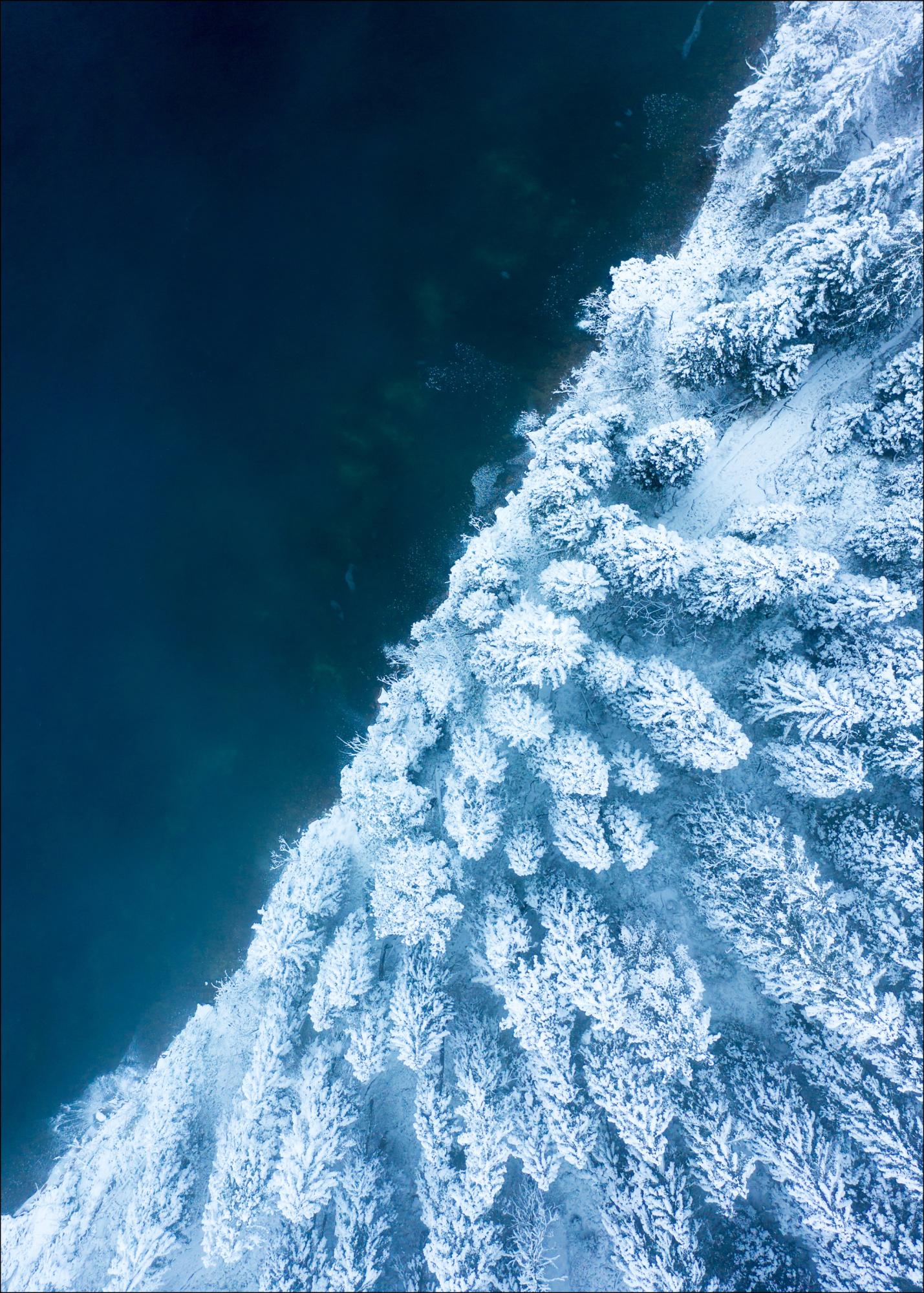Ekscytujący fotograficzny plakat z lotu ptaka, gdzie zaśnieżony las spotyka niebiesko-zamarznięte morze w ostrej przekątnej. Piękny plakat przyrodniczy w zimnych odcieniach, idealny jako część większej kolażu.