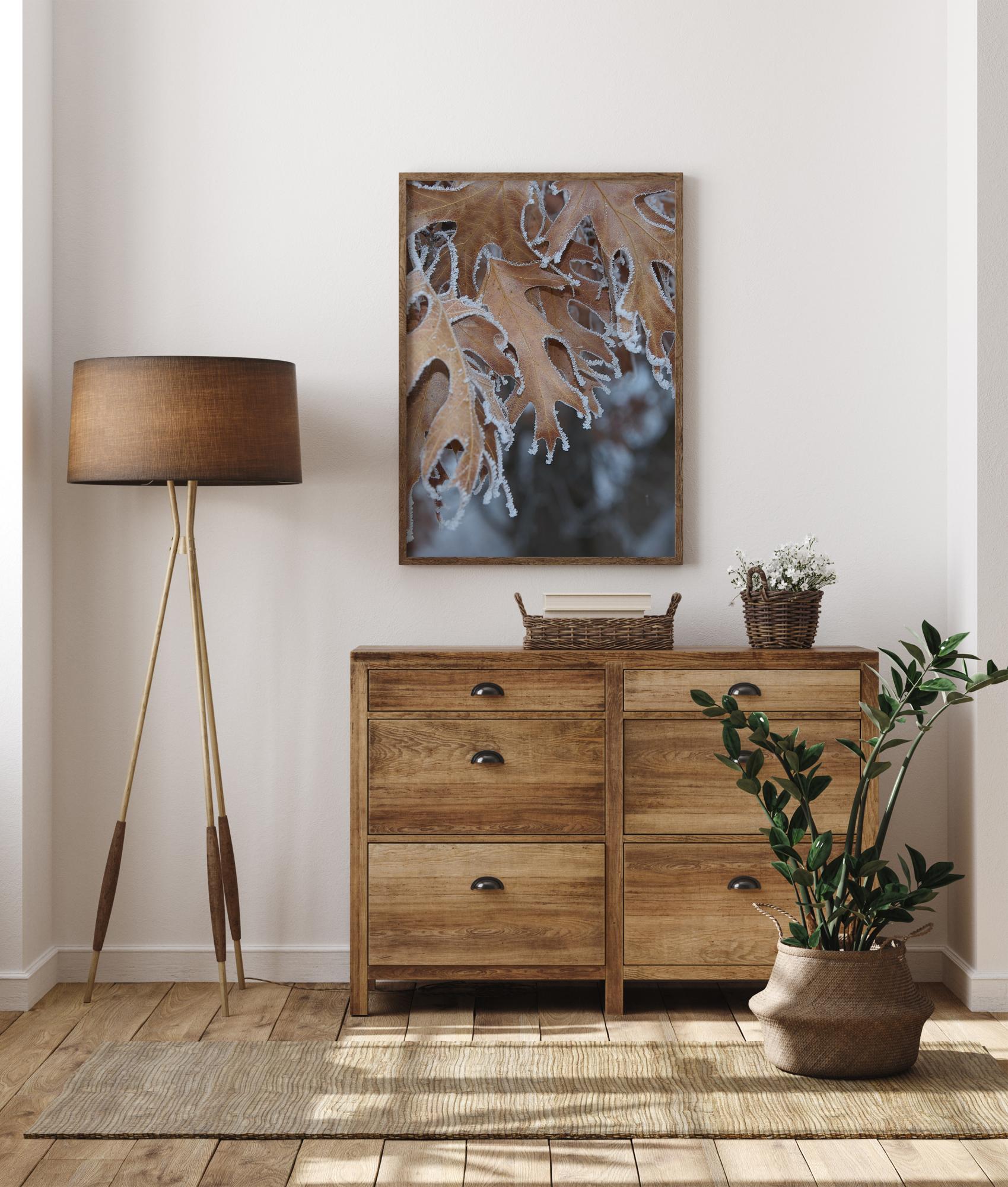 Plakat makro z jesiennymi liśćmi, pokrytymi szronem. Brązowe i suche liście zwijają się w zimnie, każdy z brzegiem z małych cząsteczek lodu tworzących rodzaj dekoracji. Poczuj chłód lodu, gdy wieszasz to u siebie.