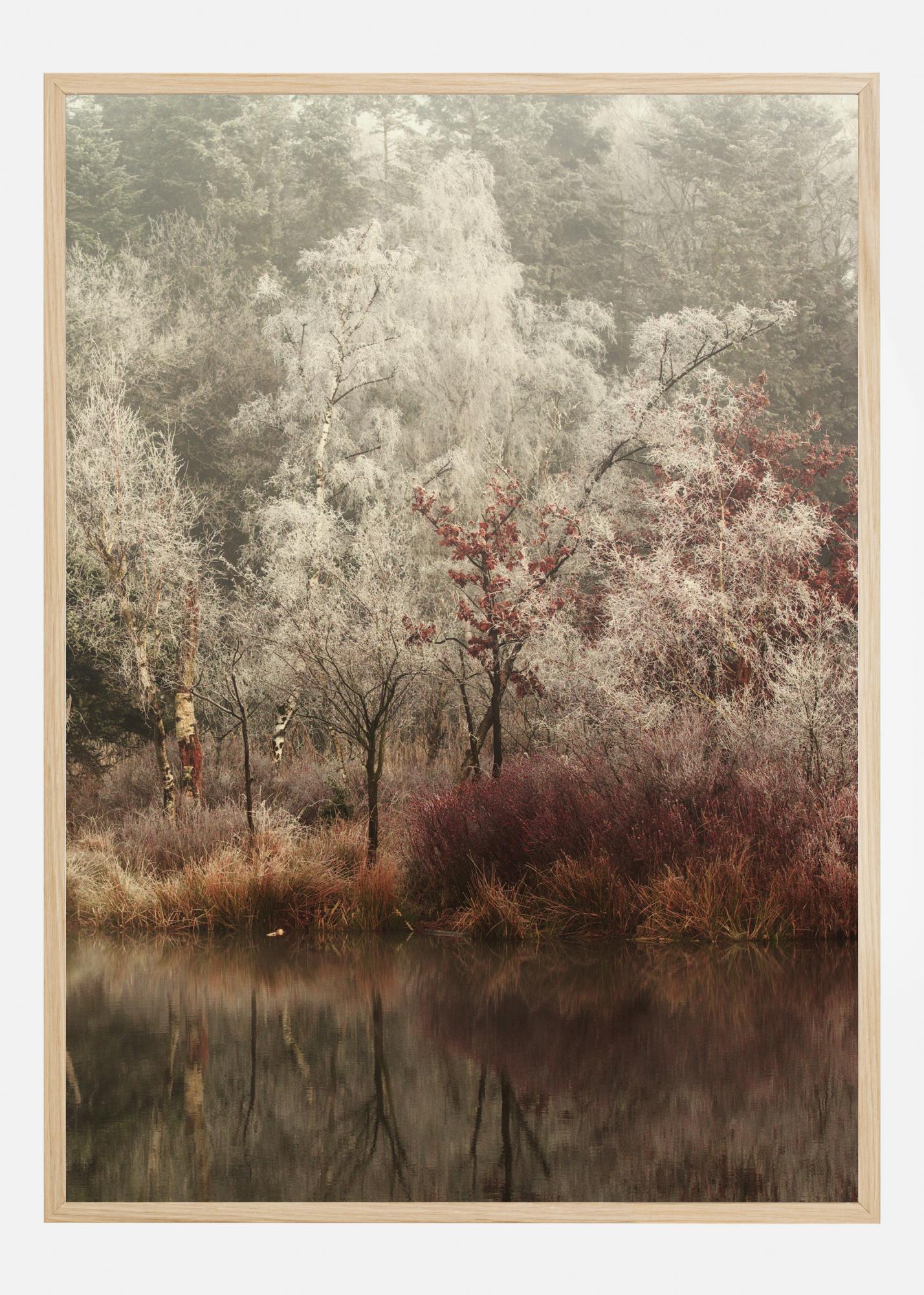 Cichy i spokojny plakat z zamarzniętym krajobrazem leśnym. Na pierwszym planie znajduje się czyste i spokojne jezioro z ciemnoczerwoną trawą oraz pokryte szronem drzewa w tle. Można niemal poczuć ciszę i spokój emanujące z tego pięknego, magicznego obrazu.