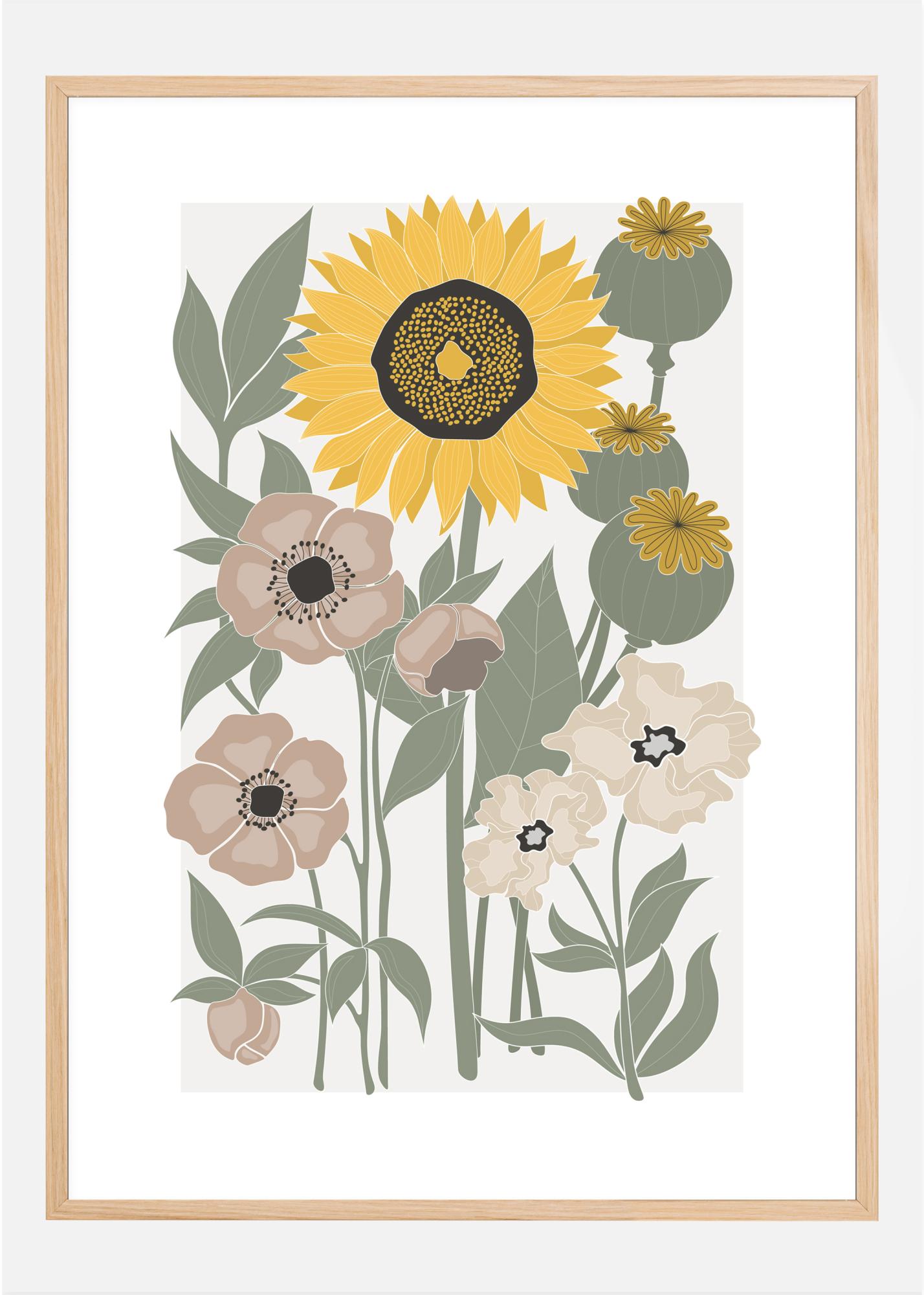 Miękki plakat z różnymi kwiatami. Jasny słonecznik dominuje środek obrazu wraz z innymi kwiatami, takimi jak mak, na tym plakacie ogrodowym. Prosty styl ułatwia dostrzeżenie szczegółów i cieszenie się tym słonecznym obrazem.