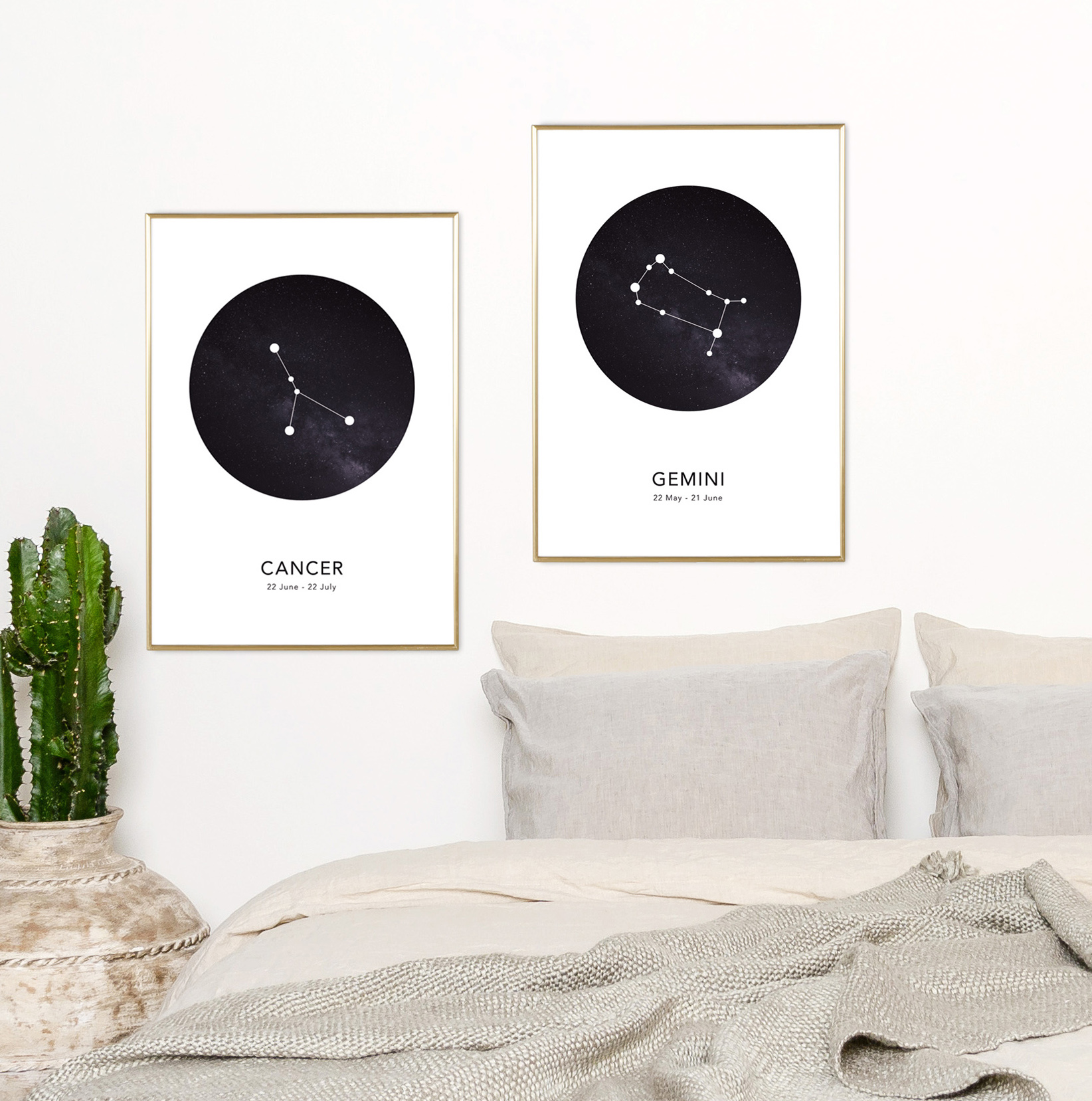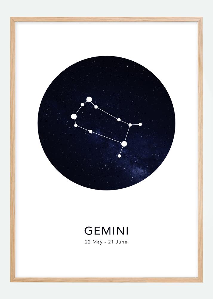 Podaruj osobisty obrazek komuś, kogo lubisz! Ten stylowy plakat przedstawia znak zodiaku Bliźnięta na tle czarno-niebieskiego nieba pełnego gwiazd. Poniżej znajduje się imię wraz z odpowiednimi datami po angielsku.