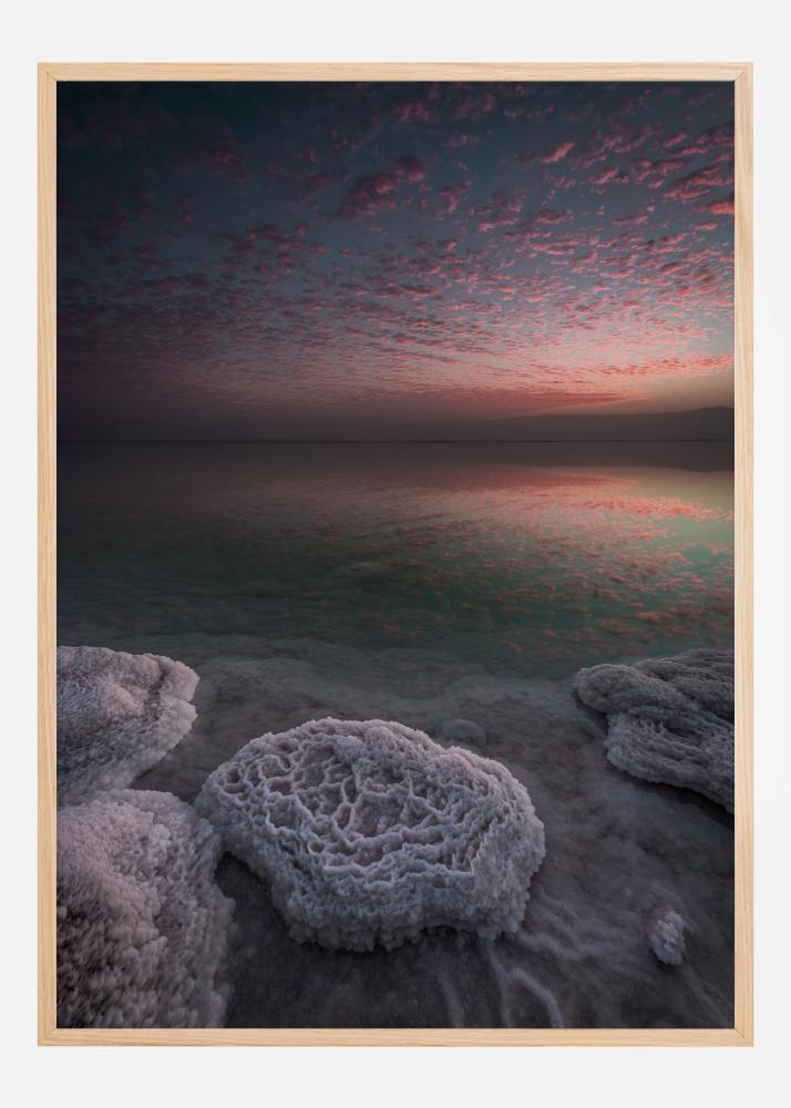 Piękny plakat z rozległym jeziorem. Na pierwszym planie utworzyły się duże kryształy soli, tworząc fantastyczne naturalne wzory. Jezioro rozciąga się w kierunku horyzontu, podczas gdy dramatycznie czerwona i niebieska nocna niebo dodają magicznego klimatu do tego obrazu.
