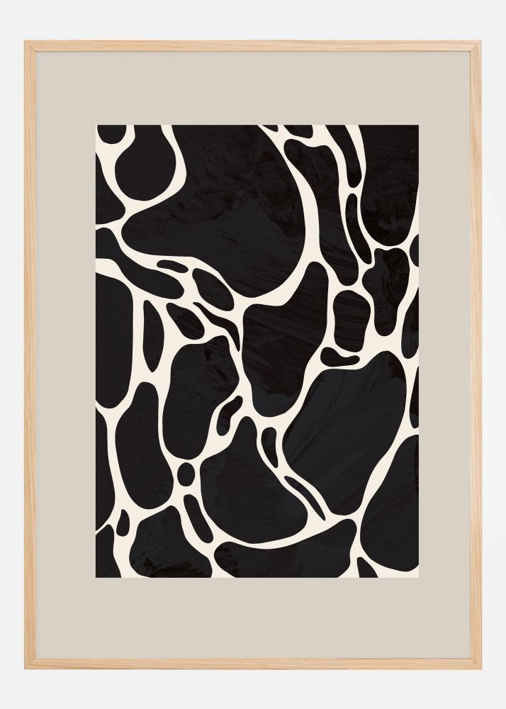 Plakat graficzny z łatami żyrafy w czerni i bieli. Duże czarne bloki kolorystyczne tworzą przyciągający wzrok obraz, a pociągnięcia pędzla w nich dodają dodatkową strukturę. Grube białe linie przecinają łaty żyrafy, tworząc przepływ i ruch w obrazie.