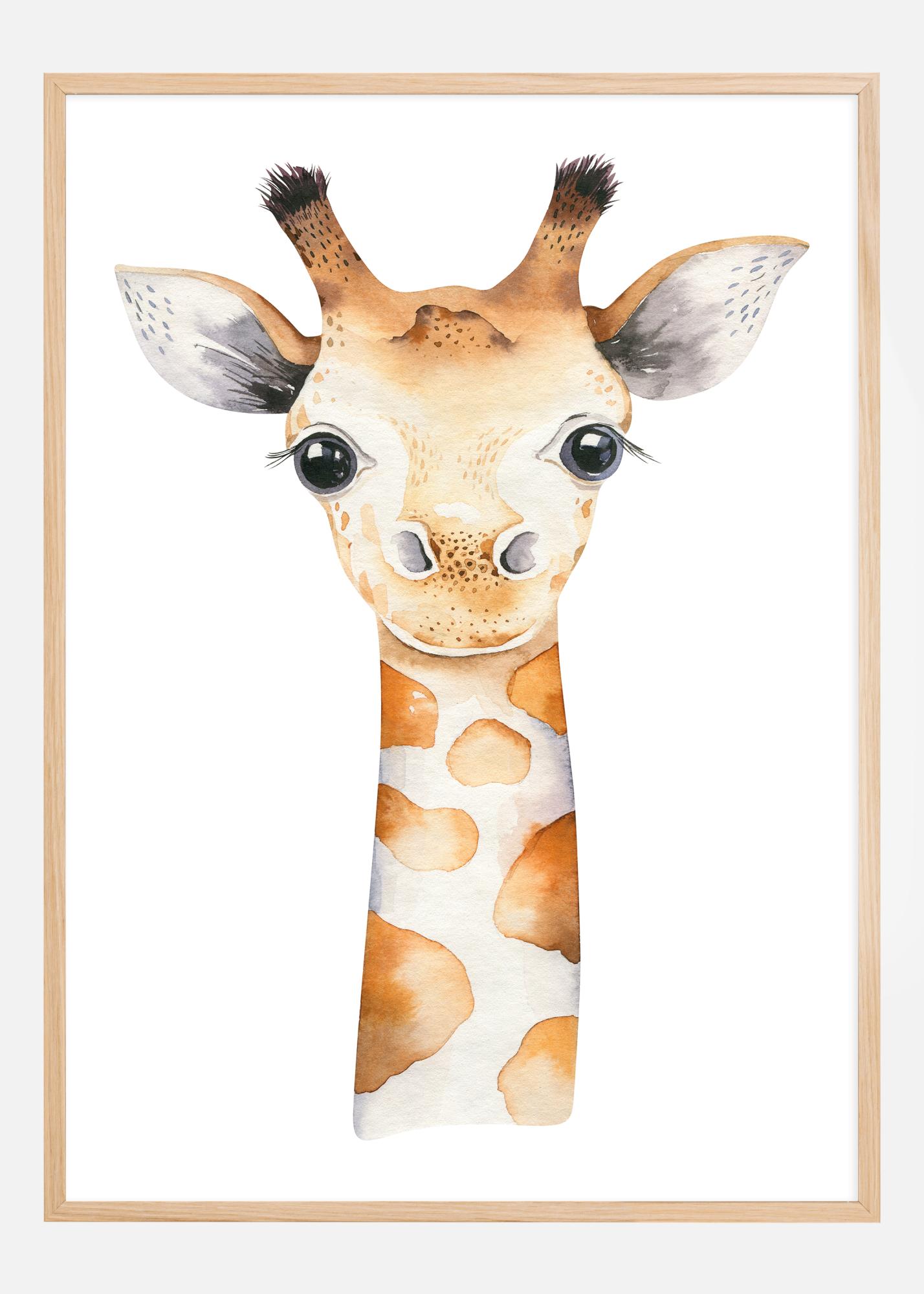 Ten uroczy portret młodej żyrafy, wykonany w akwareli, to plakat emanujący urokiem i ciepłem. Z jego dużymi, ciekawskimi oczami i charakterystycznymi plamkami, które figlarnie tańczą po jego długiej szyi, ten obrazek wprowadza poczucie radości i zabawy do każdej przestrzeni. Jego miękkie kolory w beżu, brązie i bieli tworzą spokojną, a jednocześnie radosną atmosferę.