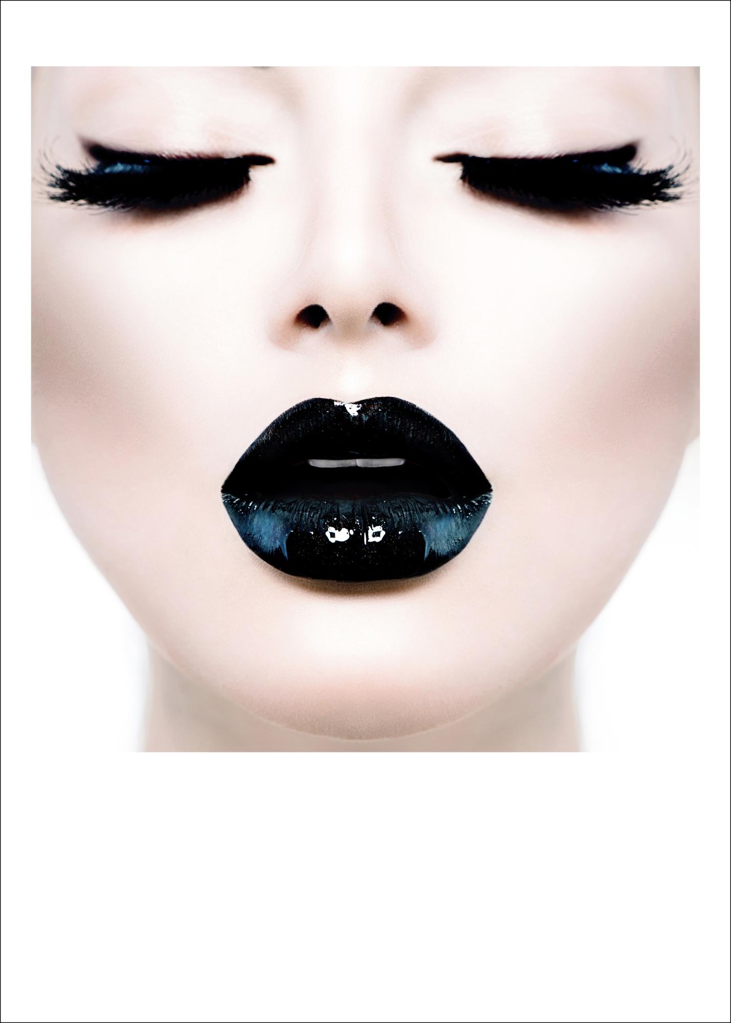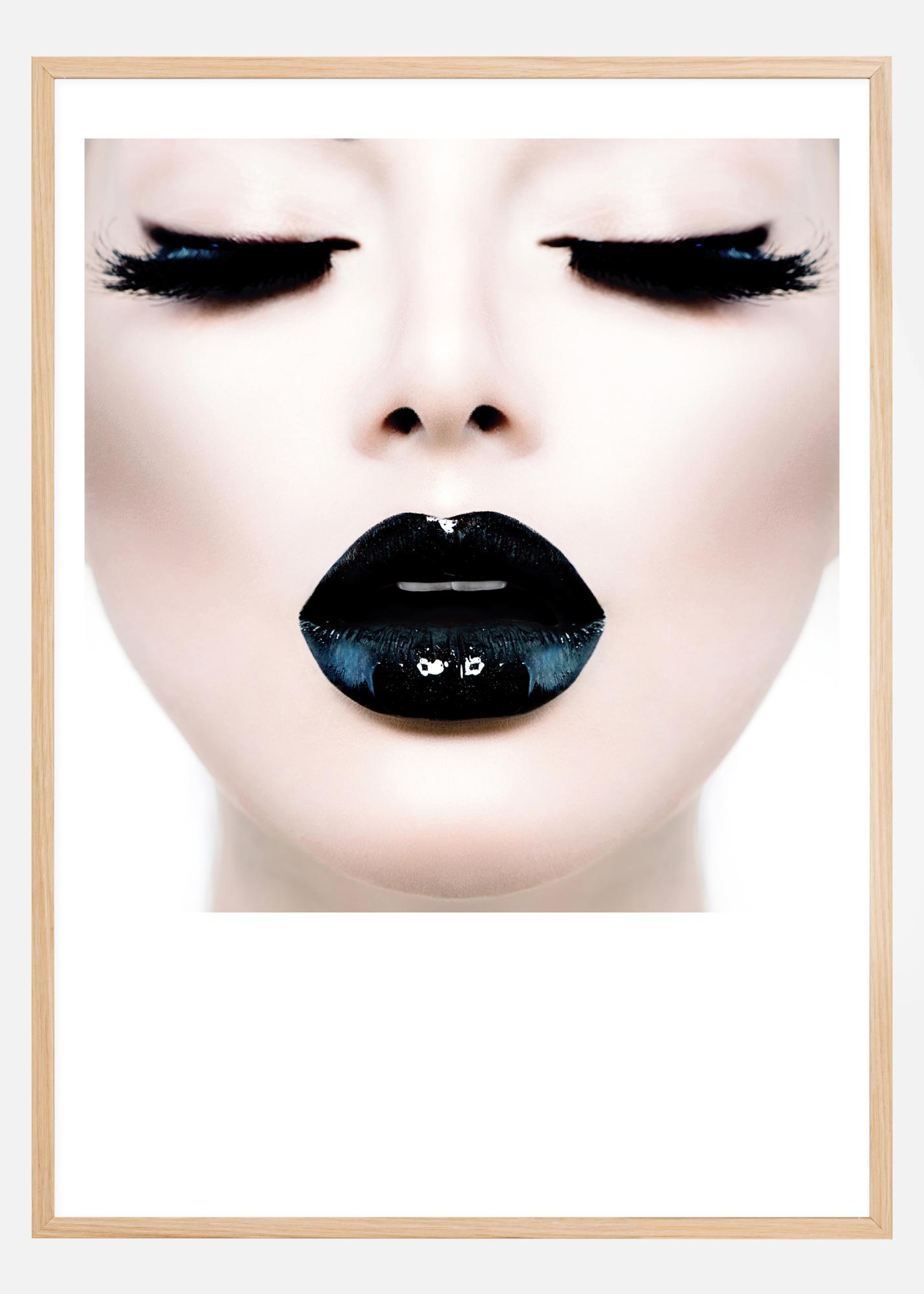 Wspaniale wyróżniający się plakat fotograficzny w temacie mody! Czarnym soczystym ustom i gęstym czarnym rzęsom towarzyszy porcelanowobiała skóra i białe tło. Elegancki plakat pełen kontrastów, łatwy do połączenia z innymi ulubionymi na większej ścianie z obrazami.