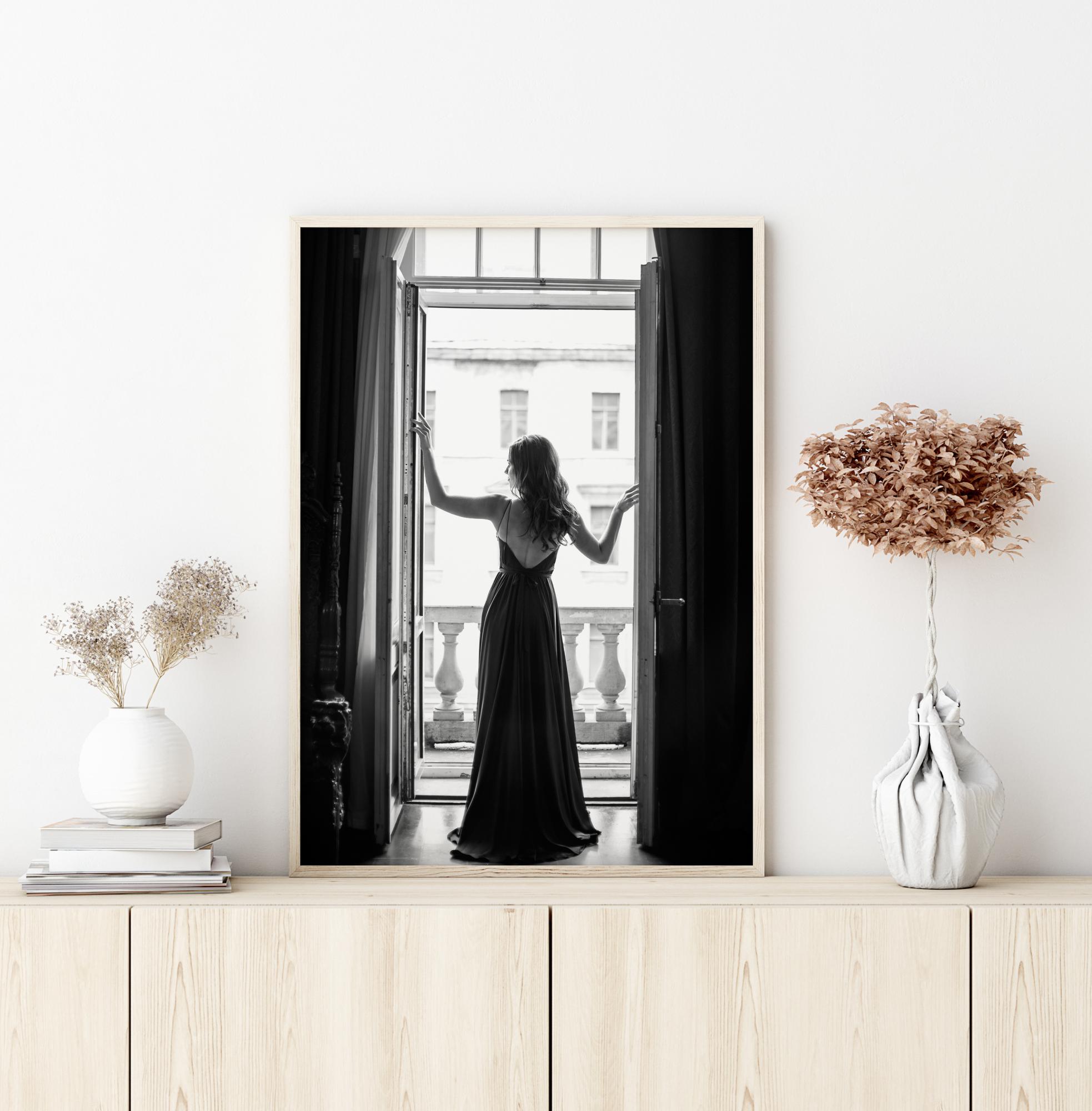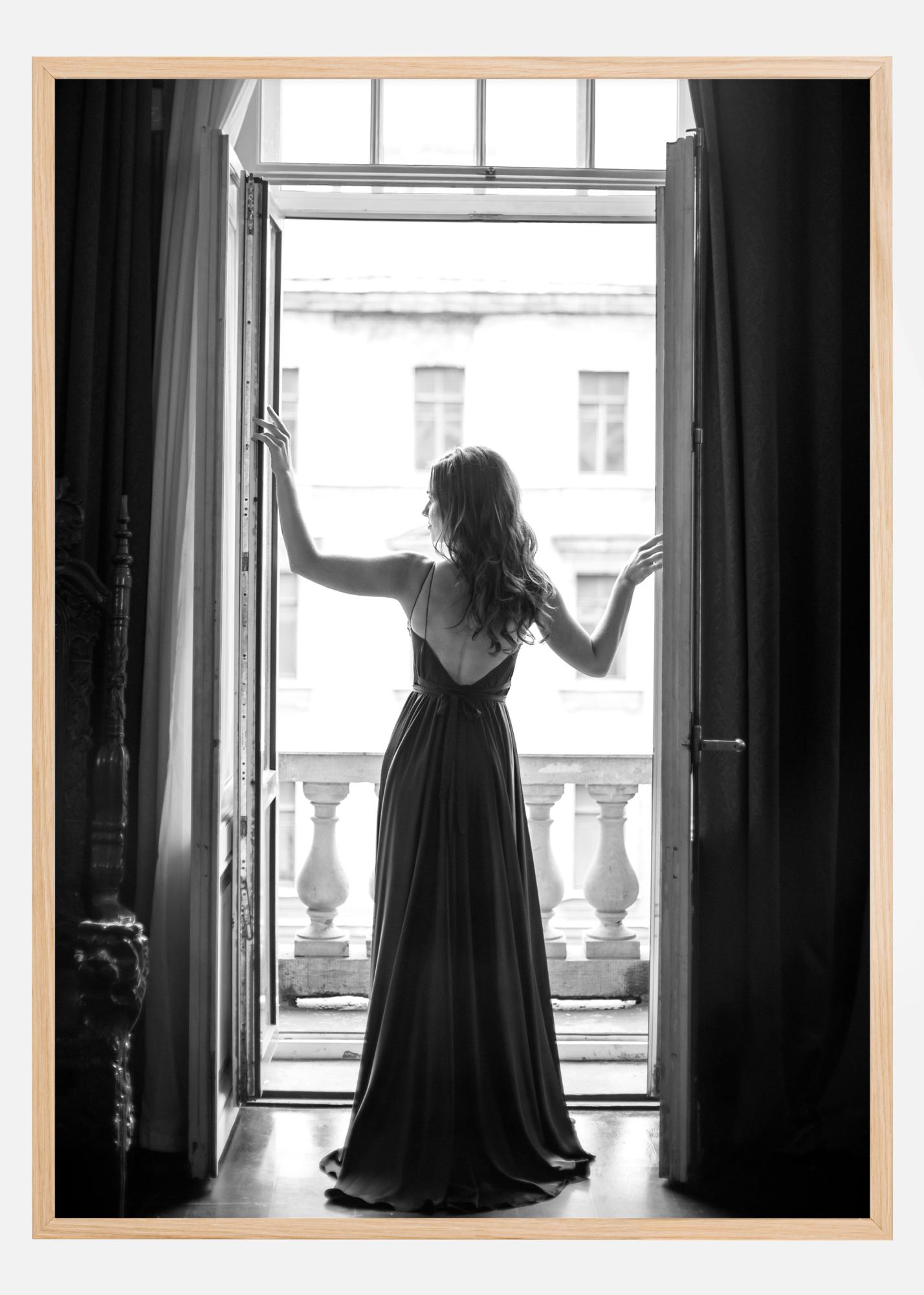 Czarno-biała fotografia kobiety w długiej sukni stojącej przy szeroko otwartych drzwiach balkonowych, patrzącej na dzień. Przed nią widać zużyte betonowe kolumny i zniszczoną starą fasadę. Plakat, który oddycha wspaniałą mieszanką piękna i życia w kontraście do starego i podniszczonego.