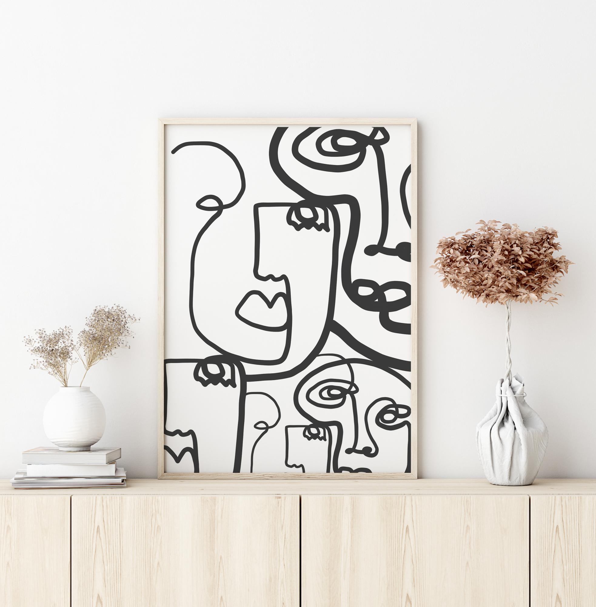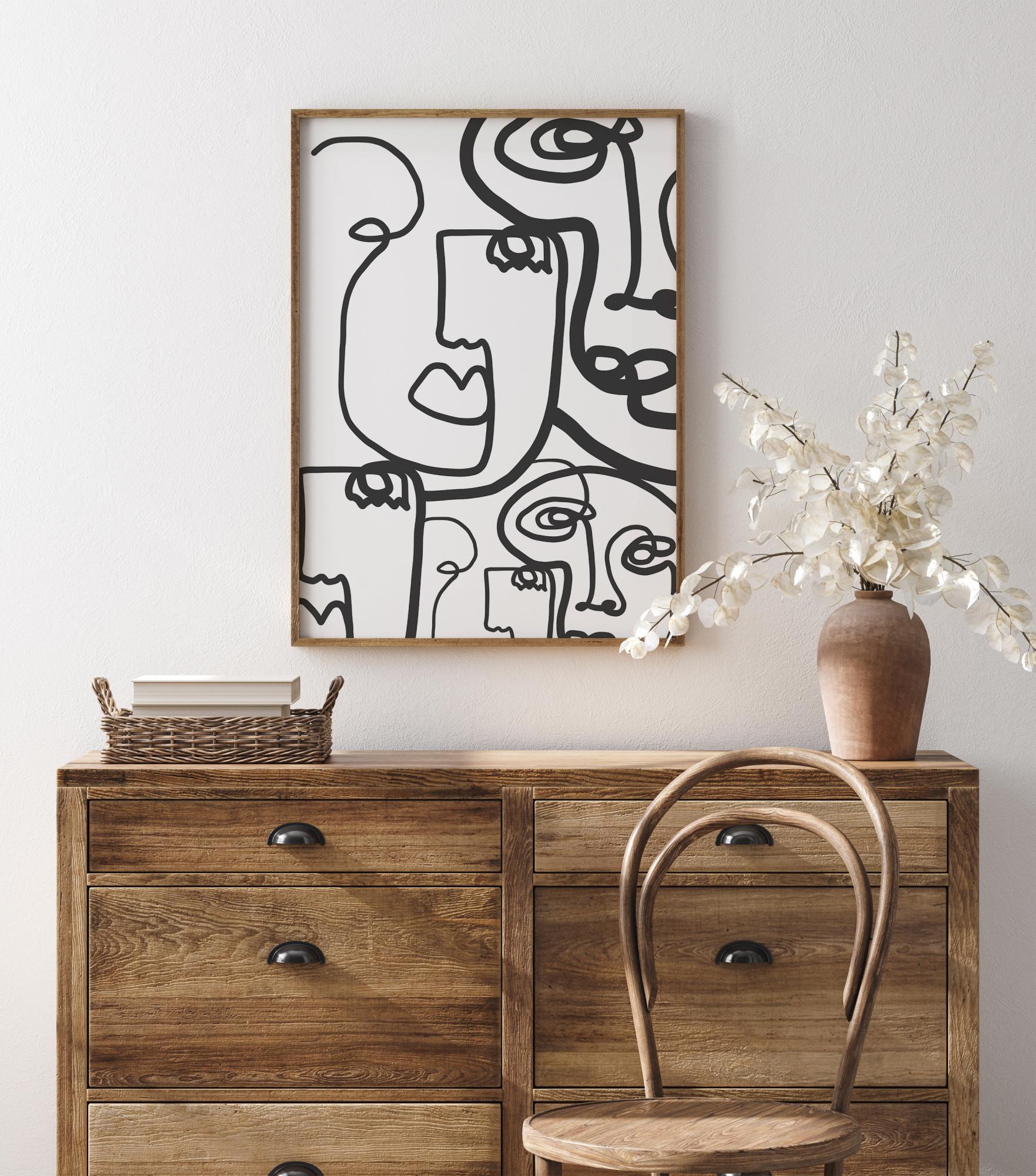 Dramatyczny abstrakcyjny plakat z wieloma narysowanymi twarzami. Grube i cienkie czarne linie wypełniają ten obraz, tworząc pięć oddzielnych twarzy. Linie wirują wokół białego tła, więc musisz się skupić, aby znaleźć wszystkie twarze ukrywające się w tym żywym obrazie.