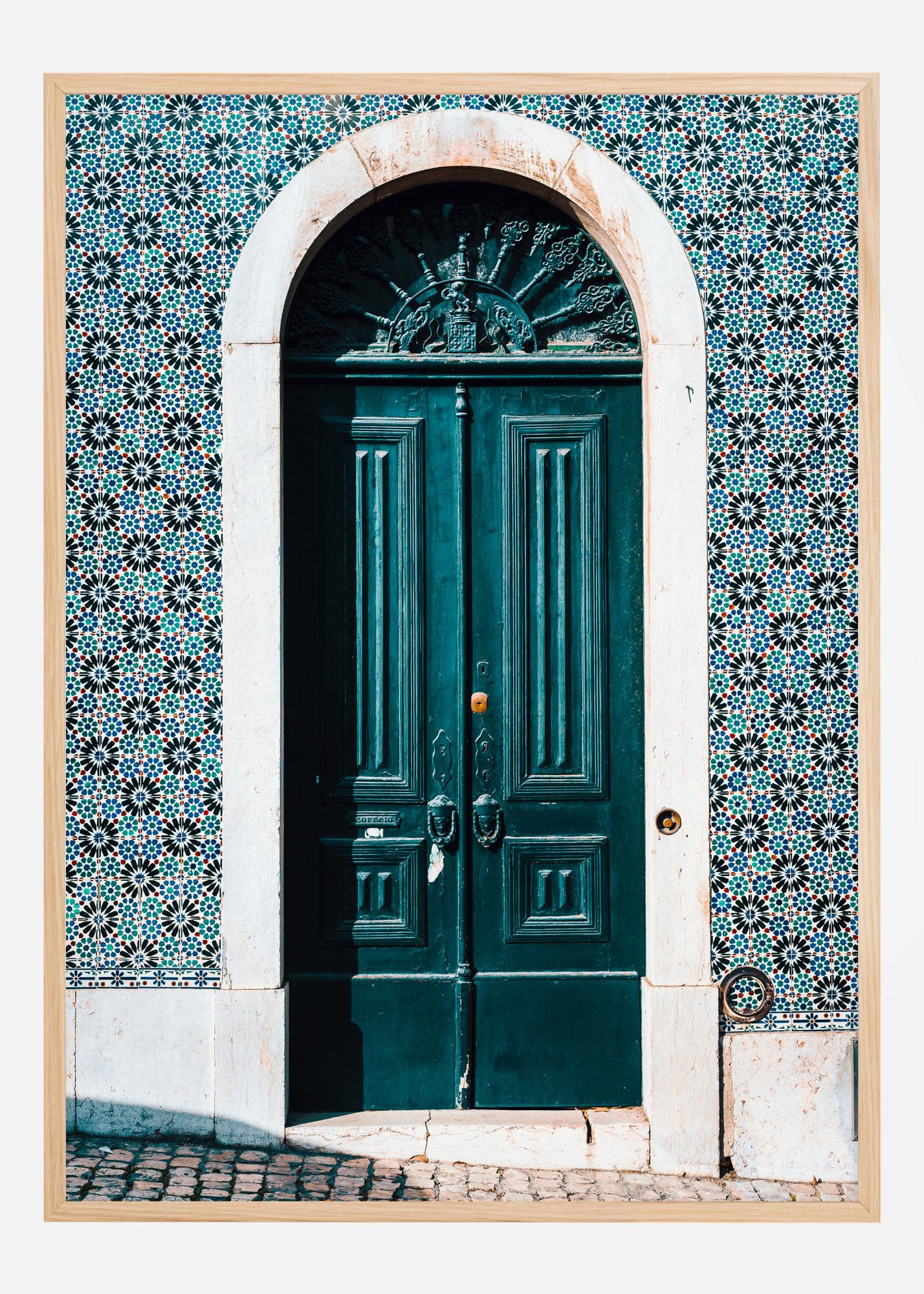 Ten stylowy plakat przedstawia okazałe zielone drzwi, które są pięknie obramowane tradycyjnymi, szczegółowymi płytkami w niebieskim i białym kolorze. Klasyczny design i intensywny kolor drzwi kontrastują z misternymi wzorami, tworząc poczucie gościnności i kulturowego bogactwa. Obraz przekazuje wrażenie zapraszającego wejścia do domu, który jest pełen historii i charakteru.