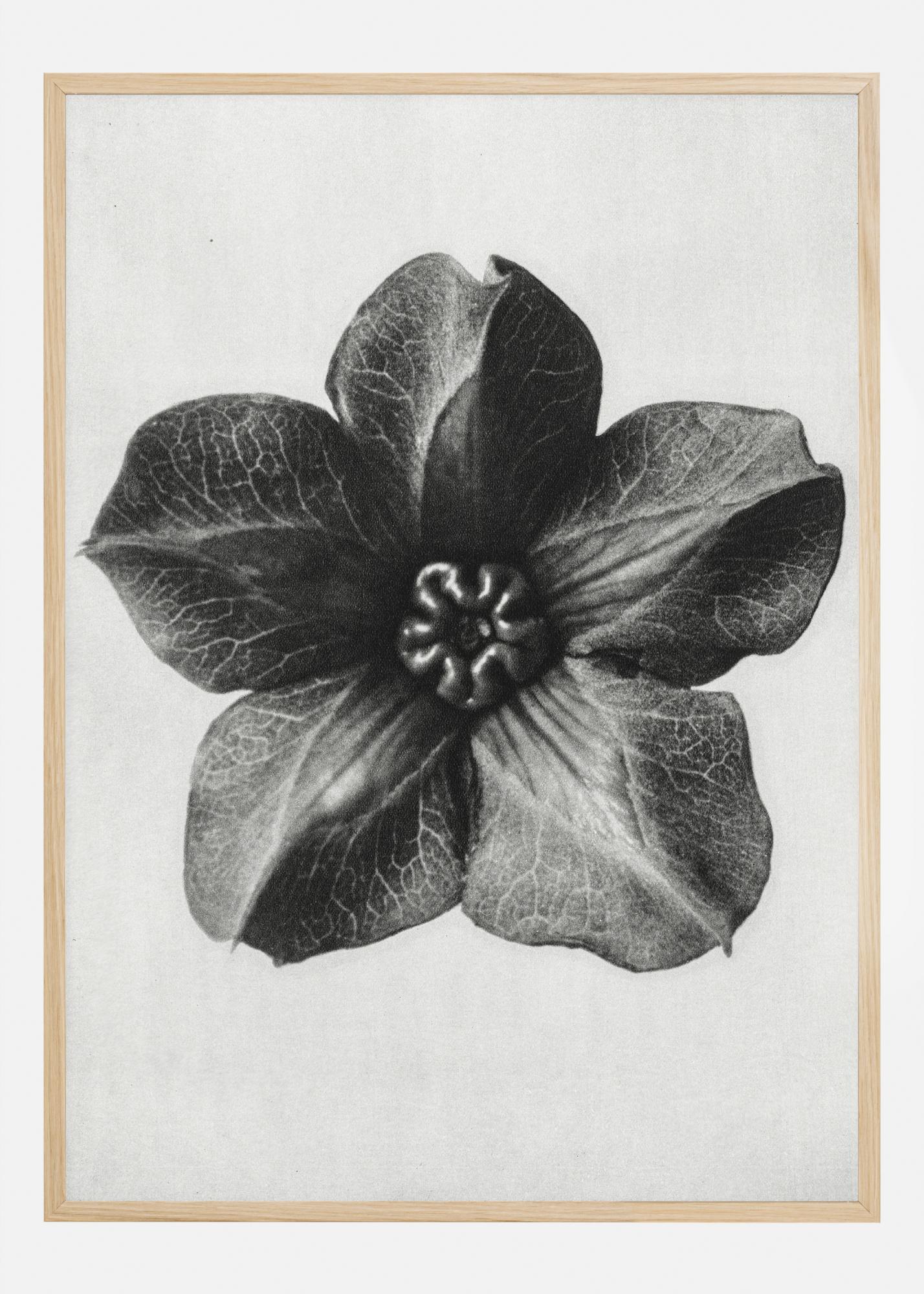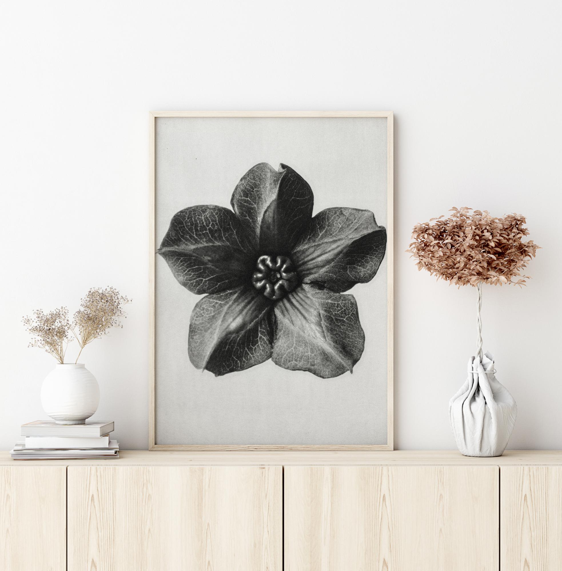 Piękny botaniczny wzór z samotną rośliną w pełnym rozkwicie. Prosty, ale piękny wzór namalowany w czerni i bieli, przedstawiający pięciopłatkowy kwiat. Ozdób swoją ścianę botanicznym plakatem, aby stworzyć naturalny klimat w swoim domu.