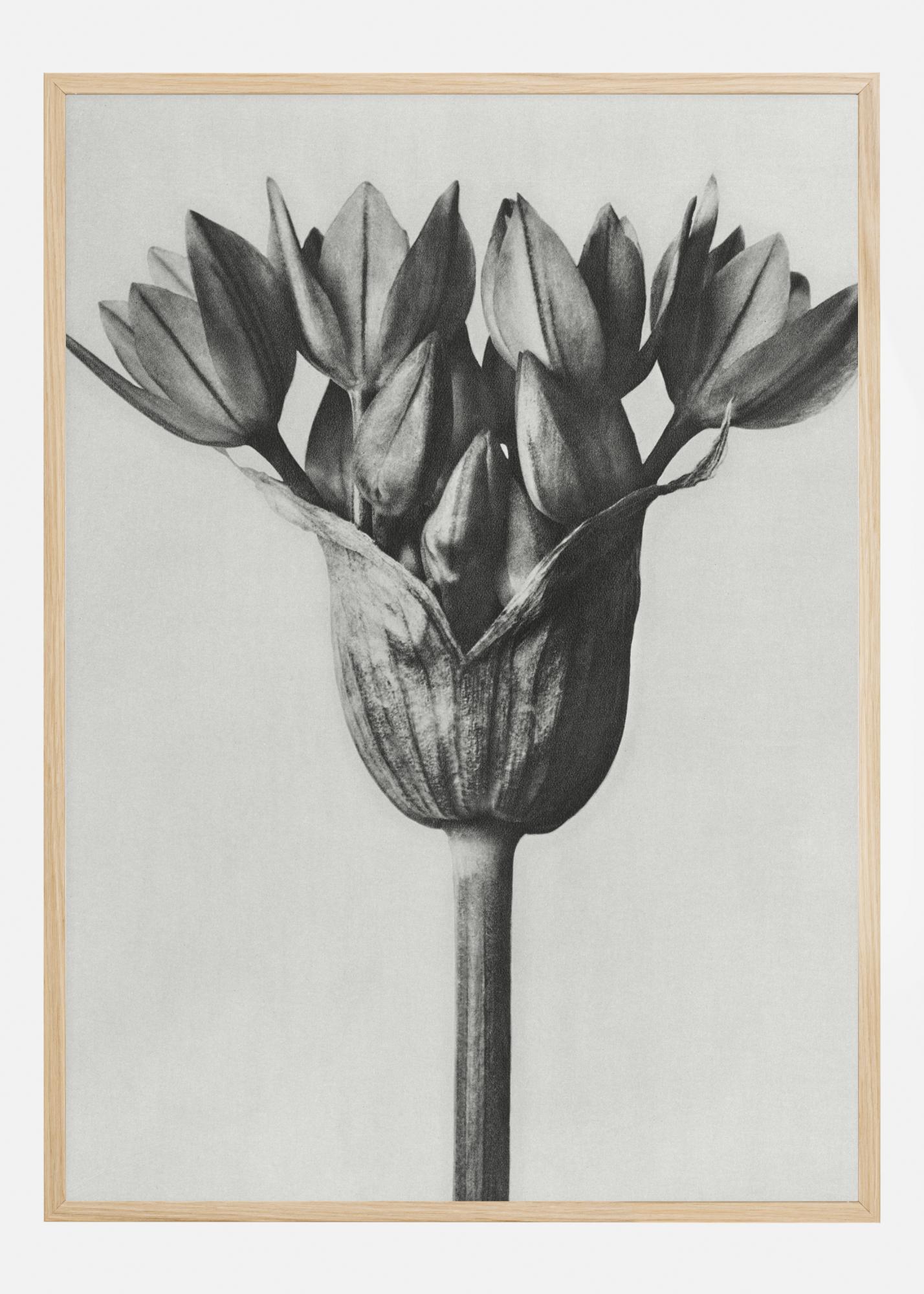 Piękny czarno-biały plakat z kwiatem, z którego wyrasta wiele mniejszych kwiatów. Przedstawia symbol szczęścia swoją elegancją i prostotą. Efekty światła i cienia tworzą piękny nadruk na prostej szarej tle. Czyni to z tego odpowiedni nadruk w przestronnym otoczeniu, takim jak salon lub sypialnia.