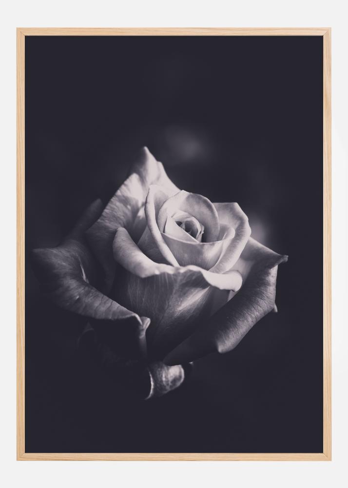 Ten wyrafinowany plakat uchwyca istotę piękna w najczystszej formie z pojedynczą szarą różą. Jej płatki rozwijają się elegancko na zewnątrz, tworząc symetryczny i atrakcyjny kształt, który jest zarówno delikatny, jak i potężny. Obraz jest głęboko szczegółowy, z miękkimi przejściami od światła do cienia, które podkreślają naturalne piękno struktury róży.