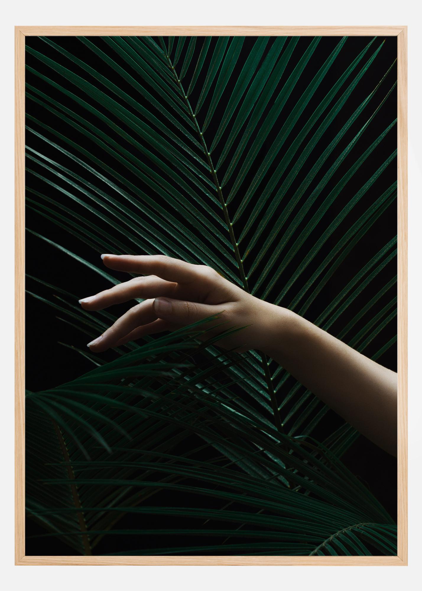 Fotografia botaniczna z zielonymi, przypominającymi palmę gałęziami na czarnym tle. Wyciągnięta ręka wnosi żywy i kontrastowy element. Ponura plakat idealnie sprawdzi się na większej ścianie z pracami.