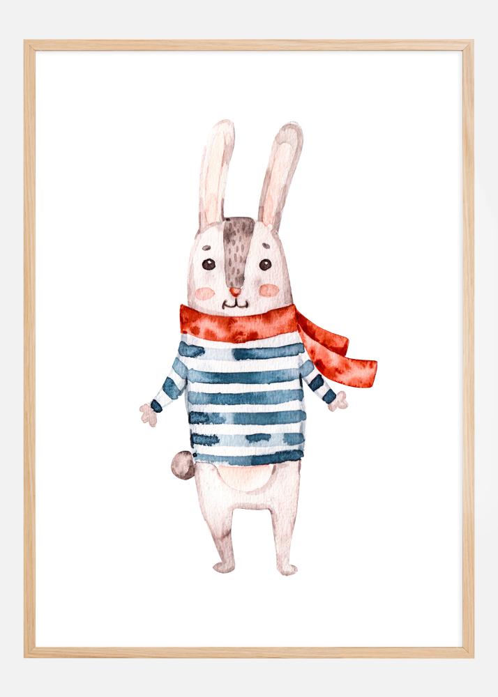 Ten uroczy plakat przedstawia radosnego królika ubranego w pasiasty sweter i powiewający czerwony szalik. Ciepły uśmiech królika i jego figlarna postawa emanują radością i niewinnością, tworząc serdeczne i zachęcające wrażenie. Ilustracja, wykonana w delikatnych tonach akwareli, ma lekkość i prostotę, które nadają jej poruszający i nostalgiczny efekt.
