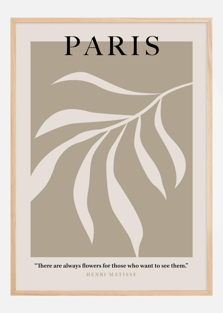 Ten elegancki i stylowy plakat honoruje Paryż, miasto, które zainspirowało tak wielu artystów i poetów. Jego prosta, ale potężna konstrukcja składa się z białych linii tworzących abstrakcyjną florę na jednolitym beżowym tle. Tekst "PARIS" jest starannie umieszczony na górze, co daje bezpośrednie skojarzenie z klasą i ponadczasowością tego miasta. Na dole znajduje się cytat Henriego Matisse'a, "Zawsze są kwiaty dla tych, którzy chcą je zobaczyć.", który dodaje warstwę głębi i refleksji do tego już znaczącego plakatu.