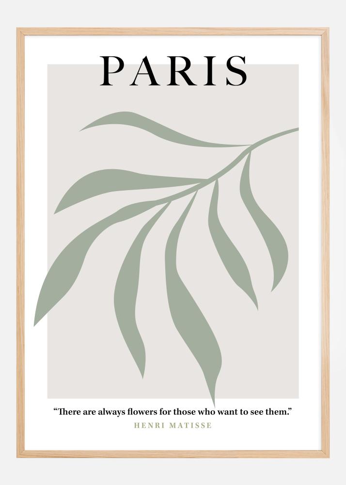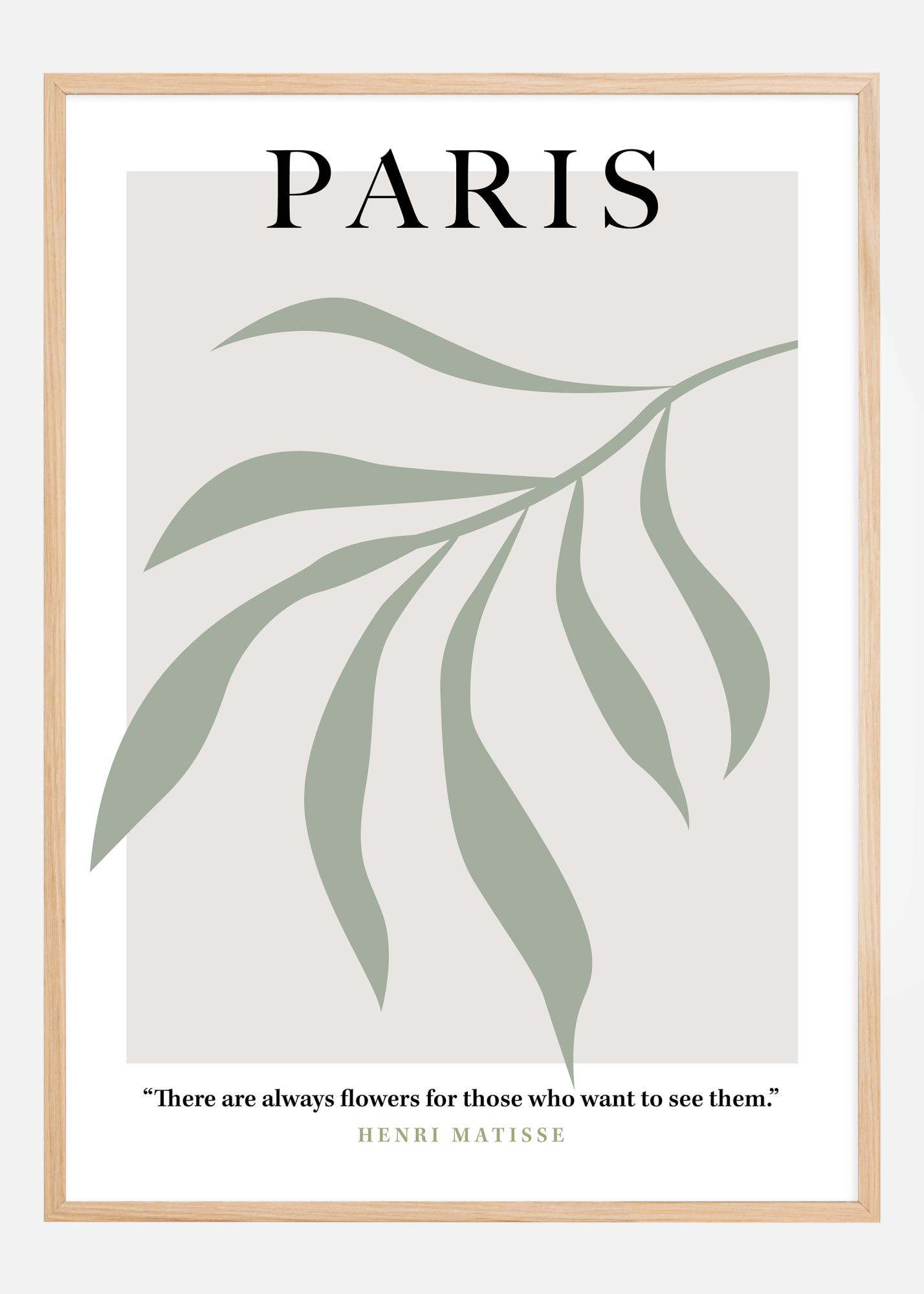 Ten stylowy i elegancki plakat nosi słowo "PARIS" dużymi literami, na tle miękkich zielonych linii tworzących abstrakcyjny, organiczny kształt, przypominający spokojne i chłodne ogrody. Jego stonowana paleta kolorów nadaje poczucie spokoju i subtelnej elegancji, co odzwierciedla reputację miasta jako centrum piękna i kultury. Dopełnia go inspirujący cytat Henriego Matisse'a, który nadaje plakatowi głębi artystycznej mądrości: "There are always flowers for those who want to see them."