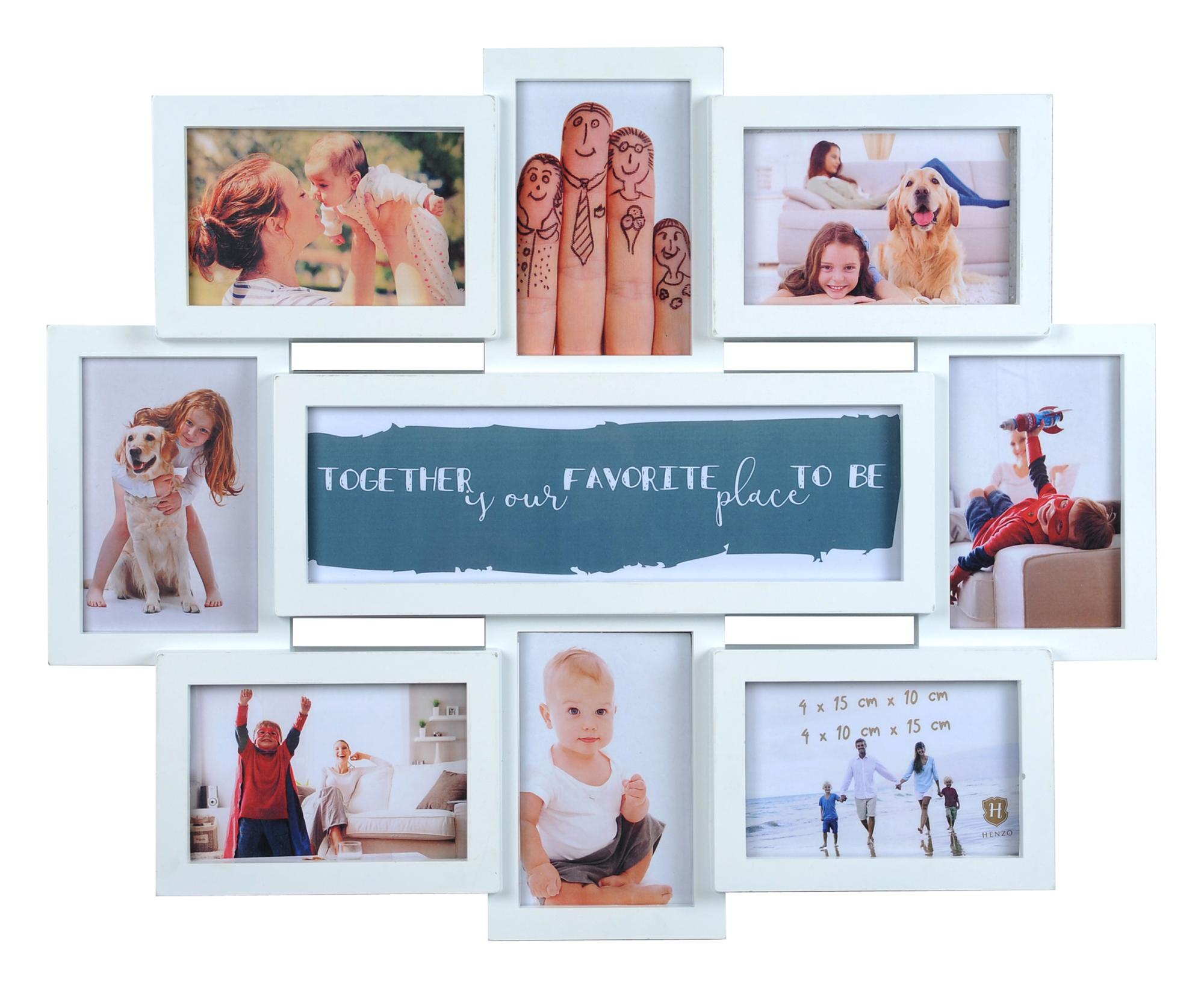Zbierz swoje najpiękniejsze zdjęcia w eleganckiej ramce na kolaż! Ta ramka nie tylko ładnie wygląda, ale można ją również przeprojektować! W zestawie znajdują się bowiem 5 uroczych napisów o różnych tematach, które umieszcza się w środkowej (9.) ramce i wymienia, kiedy masz na to ochotę. Na przykład możesz umieścić teksty takie jak "Wszystko, czego potrzebujesz, to miłość" lub "Powiedz tak rodzinie". Ramka na kolaż dostępna jest w kolorze czarnym i białym.