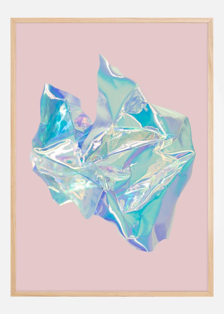 Ten plakat jest hołdem dla współczesności i eksperymentów, gdzie pofałdowana holograficzna folia unosi się na tle miękkiego różu. Jego refleksyjne powierzchnie migoczą w spektrum pastelowych kolorów, zmieniających się od akwamarynowego błękitu po delikatny lawendowy i różany róż. Ten wydruk jest doskonałą metaforą elastyczności i zmiany, idealnie pasując do nowoczesnego wnętrza, które ceni unikalne, pobudzające do myślenia detale.