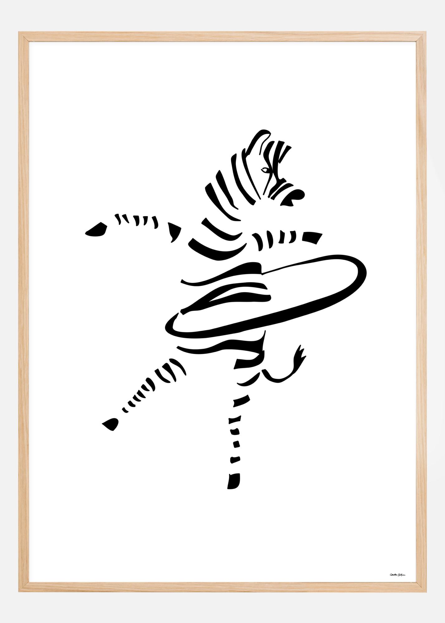 Minimalistyczny portret tańczącej zebry. Na białym tle czarne pociągnięcia pędzla umiejętnie tworzą formę zebry. Ta urocza zebra stoi na tylnych nogach i tańczy z hula hopem. Prosty, ale zabawny plakat do powieszenia na zwykłej ścianie.