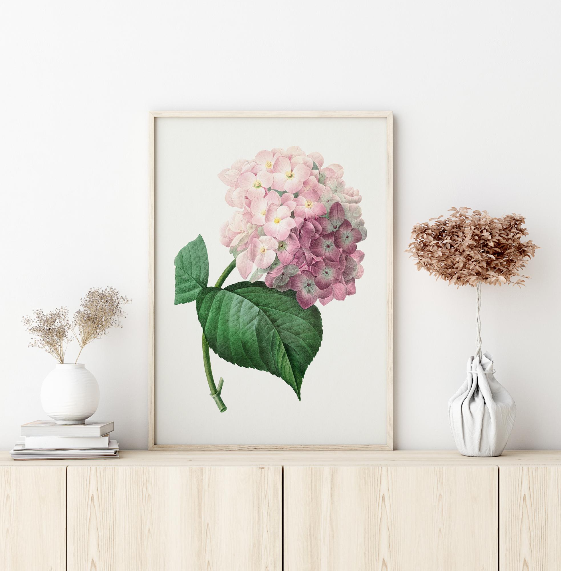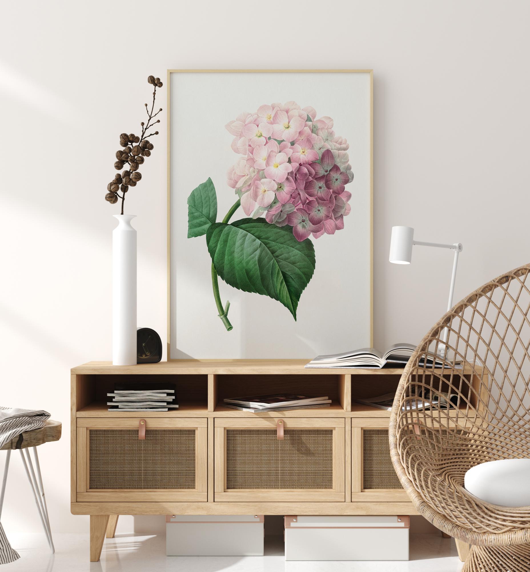 Kwiatowy plakat z hortensją. Miękkie różowe płatki z delikatną zieloną łodygą oraz zielonym liściem dominują w środku obrazu. Na czystym białym tle ten piękny, ale delikatny kwiat daje poczucie spokoju. Powieś ten obraz w oranżerii, aby dodać pomieszczeniu odrobinę dodatkowej klasy.