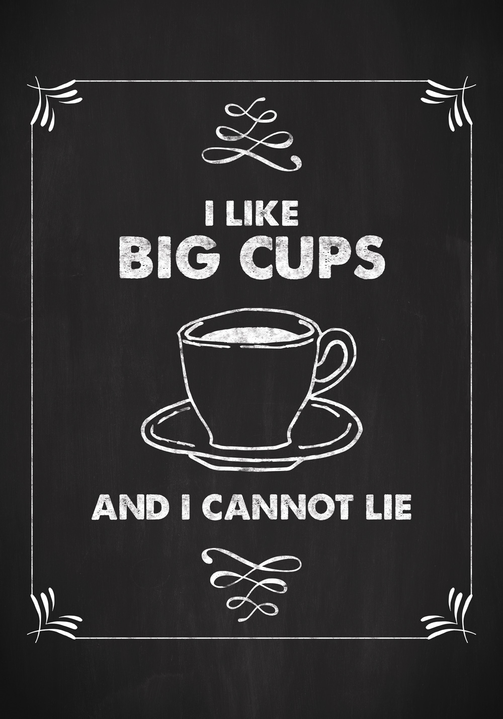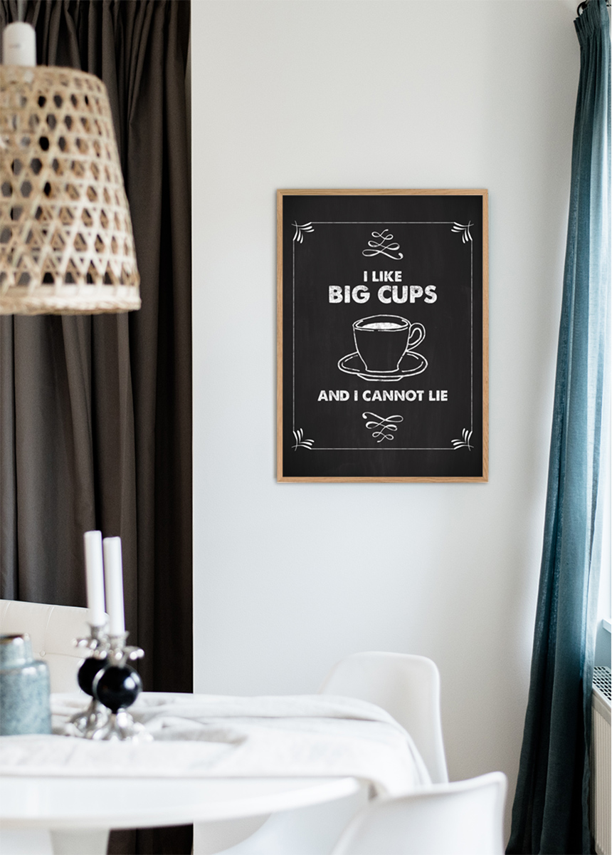 Sprytny nadruk z przesłaniem - I like big cups, and I cannot lie, dla tych, którzy lubią duże filiżanki kawy lub herbaty. Czarnobiały plakat, z uczuciem tablicy, świetnie prezentuje się na półce w kuchni obok książek kucharskich i akcesoriów kuchennych. Albo czemu nie powiesić go razem z innymi grafikami na ścianie z tematem kuchennym. Uzupełnij plakat prostą czarną ramką, która pozwala tekstowi mówić i wzmacnia wrażenie tablicy szkolnej.